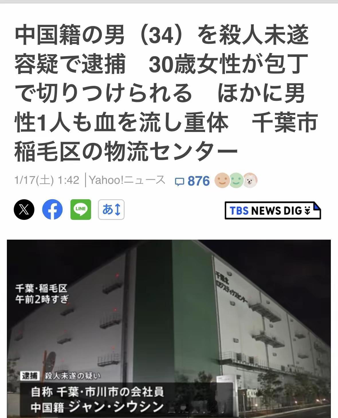 1月16日凌晨一个中国34岁男子李某在日本千叶某物流中心手持菜刀,向同事头上砍去,当场砍伤一名女人没有生命危险,另外一个男人重伤,送医院抢救👍。