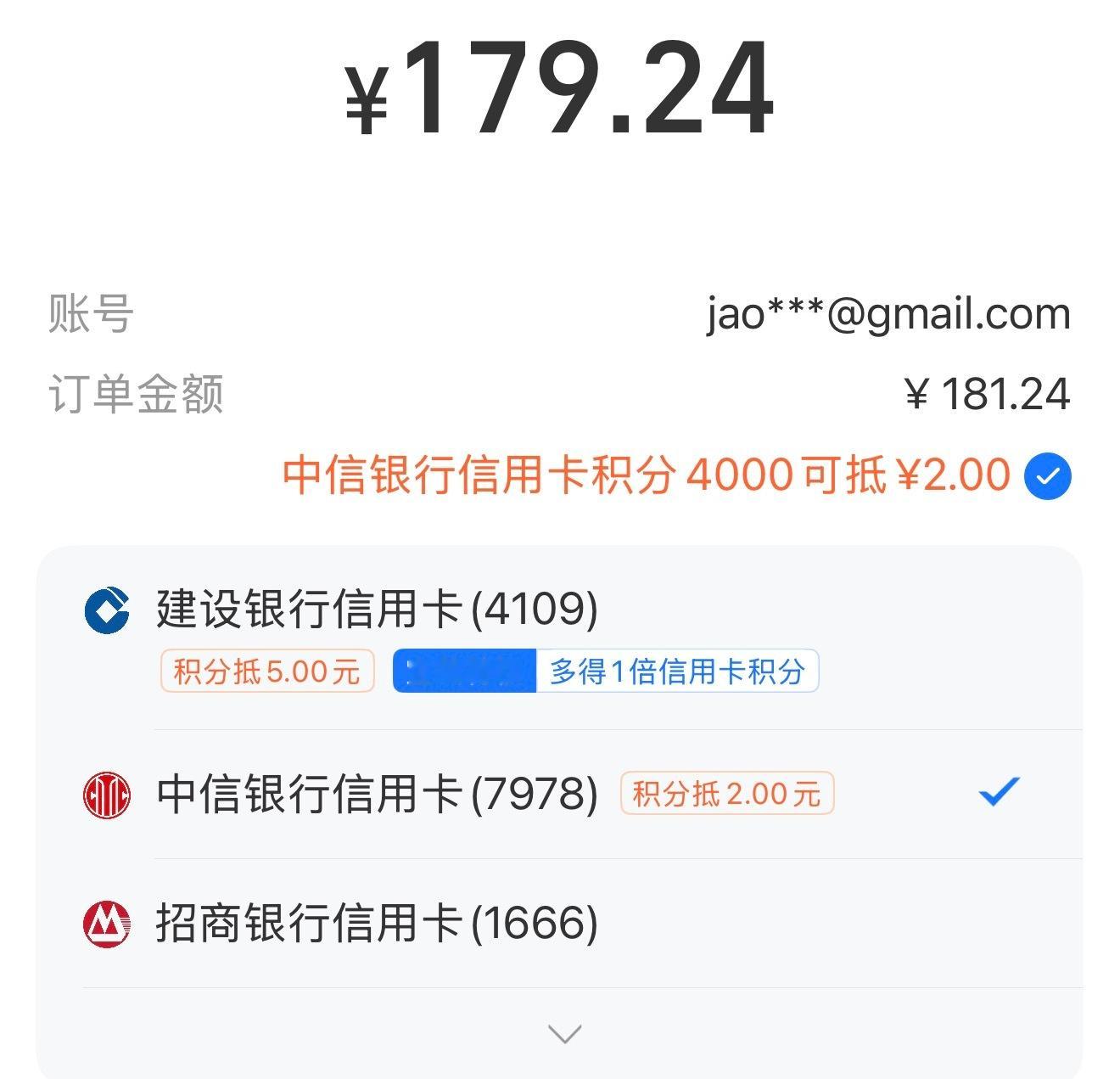 支付宝不知道啥时候出了个信用卡积分抵扣现金的功能,如果你是高端点的信用卡,可以考虑关闭掉。像我这个信用卡是8:1累积里程的,4000分就是500里程,怎么算都有个三四十块钱,如果用支付宝抵扣现金,只能抵扣两块钱