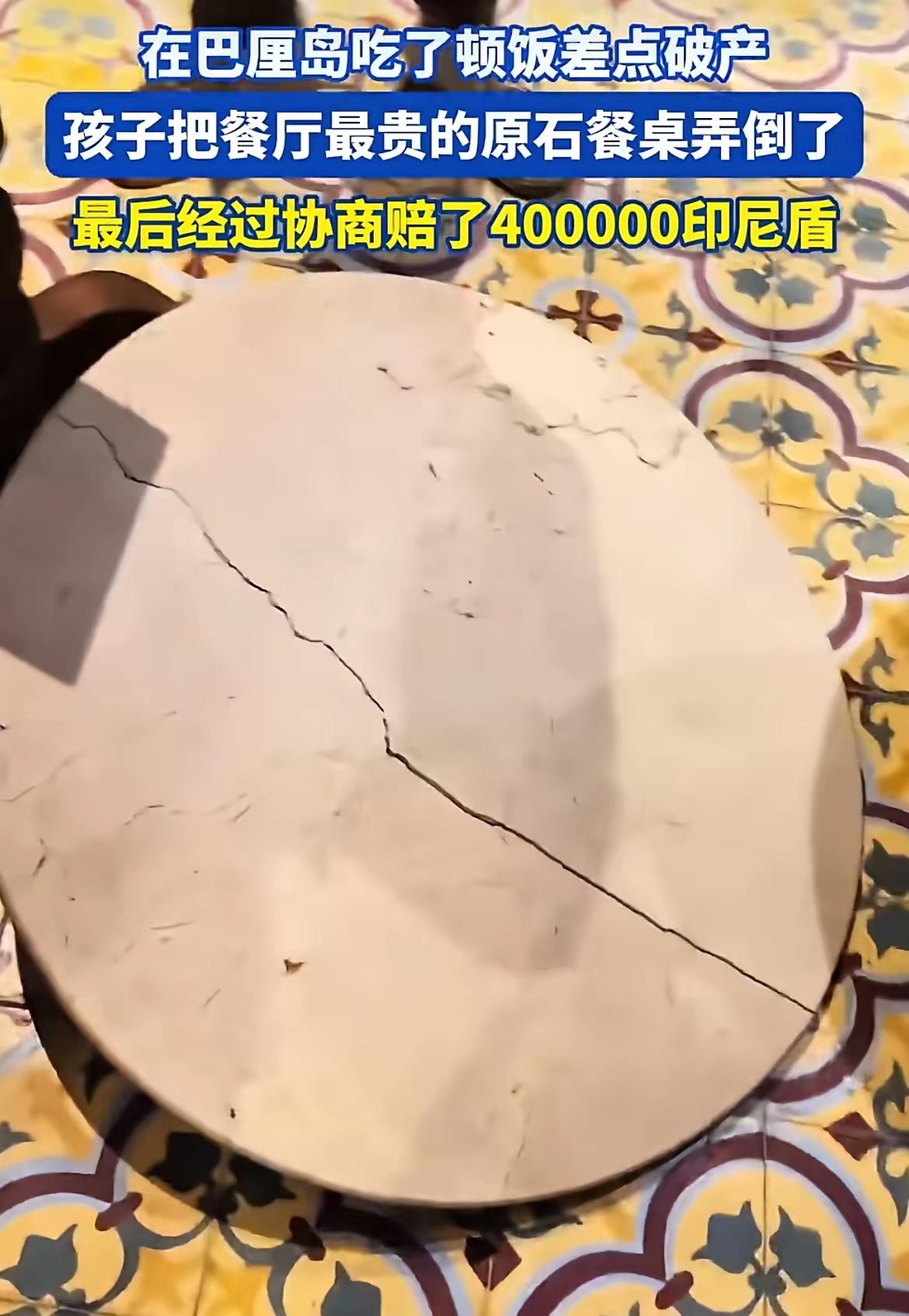 中国游客带孩子在一家当地餐厅吃饭,小孩不老实,把一个原石做餐桌给碰倒了,桌子裂成两半,中国游客当时吓傻了以后这个原石桌子很值钱,老板会不会讹诈他,与老板协商赔偿,老板当时说了40万,他听了直接就说了让我破产也培不起40万,你这个不是欺负中国人吗?我要报警,后来经过详细沟通原来是40万印尼盾,合人民币165元,这个价格真的是良心价。