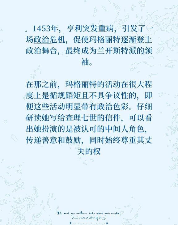 。1453年,亨利突发重病,引发了一场政治危机,促使玛格丽特逐渐登上政治舞台,最 。1453年,亨利突发重病,引发了一场政治危机,促使玛格丽特逐渐登上政治舞台,最终成为兰开斯特派的领袖。 在那之前,玛格丽特的活动在很大程度上是循规蹈矩且不具争议性的,即便这些活动明显带有政治色彩。仔细研读她写给查理七世的信件,可以看出她扮演的是被认可的中间人角色,传递善意和鼓励,同时始终尊重其丈夫的权威。同样,尽管她对赦免凯德叛乱分子的实际影响仍模糊不清,但她所承认的角色表明她是一位说情者。在这两种情况下,王后的参与都可被视为一种辅助手段,旨在推动被认为必要的计划,同时尽量减少对国王权威形象的损害。 亨利患病之前,玛格丽特似乎并非任何人的公开敌人。她当然不是约克公爵理查德的敌人,而且理查德及其妻子还把她视为可能为自己说情的人。不管她内心的真实想法如何,她似乎有意塑造一个易于接近的形象,部分是通过她的馈赠。实际上,她对危机的首次公开政治回应应被视为试图弥合分歧,而非支持某一特定派系。此外,派系这一概念本身也值得质疑,因为它源自偶然的合作和暂时的便利,有时会因形势变化而改变。约克派——即约克公爵、萨利斯伯里和沃里克的内维尔伯爵及其追随者之间的紧密联盟——在第一次圣奥尔本斯战役前后才作为一个明确的派系出现,而兰开斯特派则较为松散,出于各种原因仍积极效忠亨利的人组成,尽管其中只有部分人对约克或内维尔家族怀有具体的怨恨。事实上,如果没有约克派,也就不会有兰开斯特派。欧洲历史 英国历史