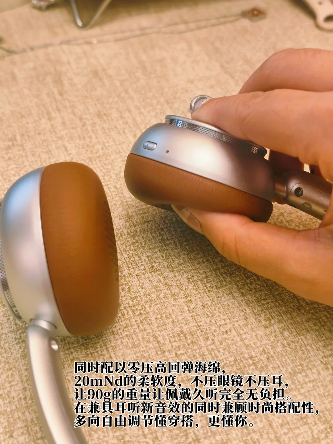 这款头戴式蓝牙耳机是我嘴头最好之一了。耳机部分采用了柔软的SPA级丝绒蛋白皮材质,细腻丝滑,循环散热不闷耳;同时配以零压高回弹海绵,20mNd的柔软度,不压眼镜不压耳,让90g的重量让佩戴久听完全无负担。在兼具耳听新音效的同时兼顾时尚搭配性,多向自由调节懂穿搭,更懂你。