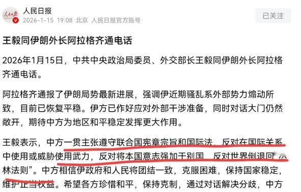 伊朗等到了中方的电话!在美国亚伯拉罕·林肯”号航母打击群正从南海调往中东之际,王毅外长作出三个表态,伊朗吃了一颗“定心丸”!1月15日,在伊朗国内局势仍不平静,美国往中东调兵之际,伊朗外长与我们王毅外长进行了通话。很显然,这个通话的时间点非常的不同寻常。 要知道,伊朗这段时间日子不好过。国内因为外汇制度波动引发了不小的骚乱,虽然伊朗政府说已经恢复平稳,还逮捕了一些煽动骚乱的头目,但局势刚稳下来,外部压力就跟着来了。 美国那边一会儿呼吁本国公民赶紧离开伊朗,一会儿从卡塔尔的军事基地撤离部分人员,还放话说“所有选项都摆在台面上”,谁都能看出来这是在施压。 更直观的是军事调动,“林肯”号航母带着舰载机联队、导弹巡洋舰和驱逐舰支队往中东开,加上还要增派的导弹防御系统,这阵仗确实够有威慑力,伊朗甚至在15日暂时关闭了领空5小时,显然是在防备可能出现的空袭。 就在伊朗内外承压的时候,中方的电话来得正是时候。王毅外长在通话里的表态,中方明确反对在国际关系中使用或威胁使用武力,不赞成把本国意志强加给别人,更不希望世界回到弱肉强食的状态,这话说得很实在,相当于直接回应了美国近期的强硬姿态。 要知道美国一直对伊朗极限施压,长期制裁不说,还动不动就威胁动武,中方这个表态,就是在明确反对这种单边霸凌的做法,给伊朗吃了颗“安全定心丸”。 接着中方表示相信伊朗政府和人民能团结一致克服困难,保持国家稳定,维护自己的正当权益。这句话看着简单,但分量不轻。 伊朗之前已经强调过骚乱是外部势力煽动的,现在中方公开表达对伊朗维护国家稳定的信任,其实就是在尊重伊朗的主权,不干涉他国内政。 要知道美国那边还在公开支持伊朗的抗议活动,甚至呼吁抗议者“接管机构”,两相对比之下,中方的立场更显公正,也让伊朗感受到了理解和支持。 最后中方呼吁各方保持克制,通过对话解决分歧,还明确表示愿意为此发挥建设性作用。这一点特别重要,现在中东的紧张气氛越来越浓,美国的军事部署只会让局势更紧绷,伊朗也已经做好了最高战备状态,双方这么对峙下去,很容易擦枪走火。 中方主动提出愿意推动对话,相当于给局势留了个缓和的出口,毕竟武力解决不了任何问题,只会让矛盾更复杂。 可能有人会觉得,不就是通个电话吗?其实不然,这通电话的意义远不止表面交流。当前国际社会大多对中东的军事对抗感到担忧,却很少有国家敢明确站出来发声,中方在这个关键节点和伊朗通话,本身就是一种态度。 美国一直想通过极限施压让伊朗妥协,甚至图谋政权更迭,但中方的表态打破了这种单边施压的节奏,让国际社会看到还有不同的声音,还有通过和平方式解决问题的可能。 伊朗外长在通话里也特意提到,期待中方为地区和平稳定发挥更大作用,这说明伊朗心里清楚,中方的立场在当前局势下有多重要。而且中方的表态是有实际的原则支撑,既不偏袒任何一方,也不纵容单边主义。 反观美国的操作,一边喊着“快速、决定性打击”的口号,一边忙着调动兵力,可实际上这种威慑未必能达到目的。 伊朗已经明确表态,如果遭到攻击会果断还击,不仅会针对以色列本土,还会打击美国在中东的军事基地和舰船,真打起来,美国未必能占到便宜。而中方的介入,恰恰提供了一个更理性的解决方案,让局势有了降温的可能。 其实历史已经多次证明,迷信武力、搞单边制裁根本解决不了问题。美国对伊朗的长期制裁,没让伊朗屈服,反而让地区局势更紧张;之前的军事打击尝试,也只是引发了更多的对抗和仇恨。 中方这次的表态,是在维护国际法和国际关系基本准则,这不仅对伊朗有利,对整个国际秩序的稳定都有好处。 这通电话之后,相信伊朗心里会更有底,不用在内外压力下慌了阵脚。而美国也该明白,单边施压的时代早就过去了,想要解决问题,还是得回到谈判桌前。 中方愿意发挥建设性作用,但最终能不能缓和局势,关键还得看各方能不能放下对抗思维,真正坐下来沟通。 在当前动荡的国际局势里,中方的这次通话和表态,就像一股理性的力量,让中东的紧张局势有了一丝缓和的希望,也让更多国家看到了和平解决争端的可能性。 对于此事,大家有什么看法呢?欢迎在评论区留言讨论! 官媒信源链接 中华人民共和国外交部:王毅同伊朗外长阿拉格齐通电话