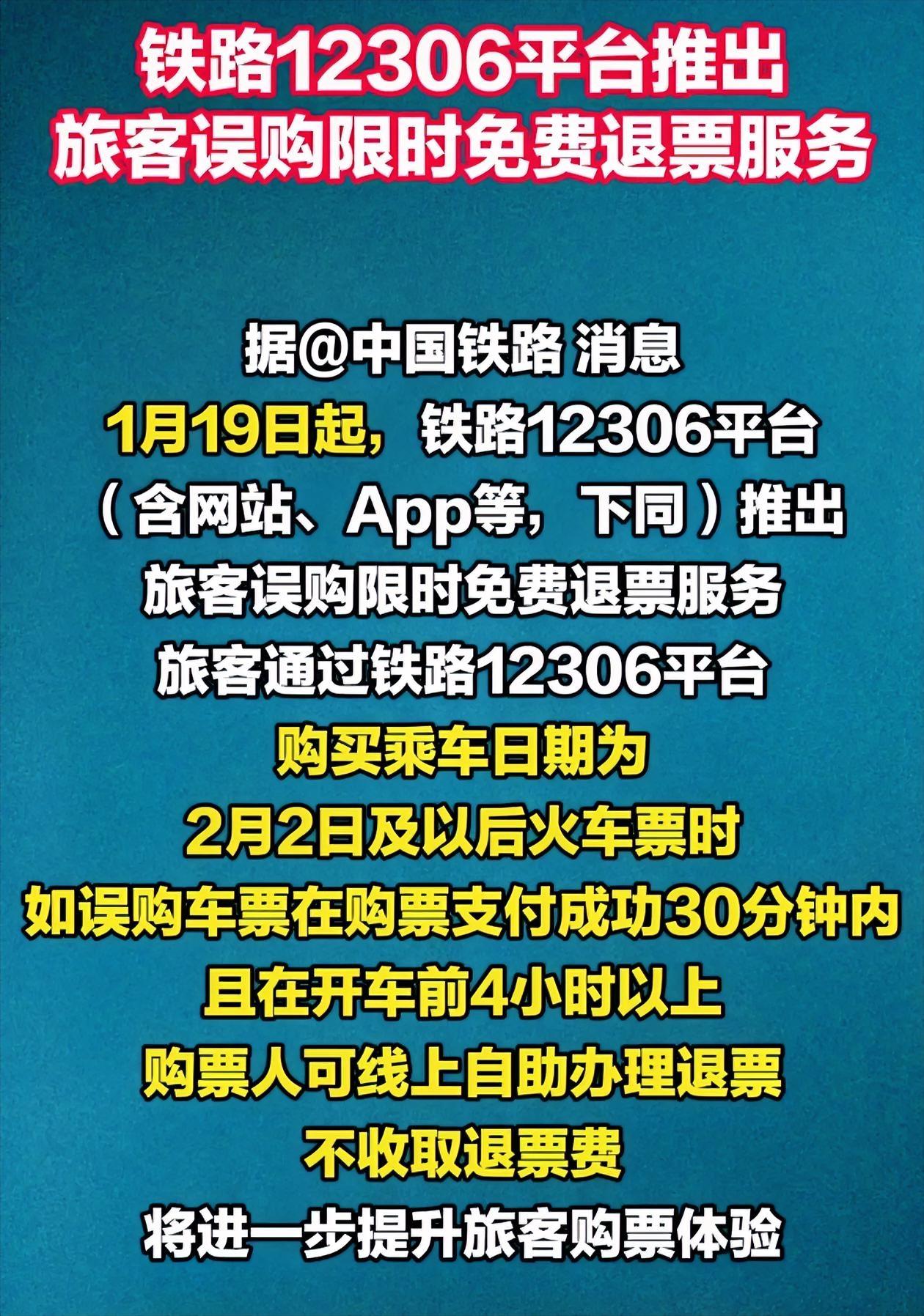 对于人们有时购买车票,买错票的情况。以前我们退票都要收取费用的,铁路部为了将进一步提升旅客的购票体验。从1月19日起如误购车票在购票支付成功30分钟内且在开车前4小时以上购票人可线自助办理退票,不收取退票费。铁路购票