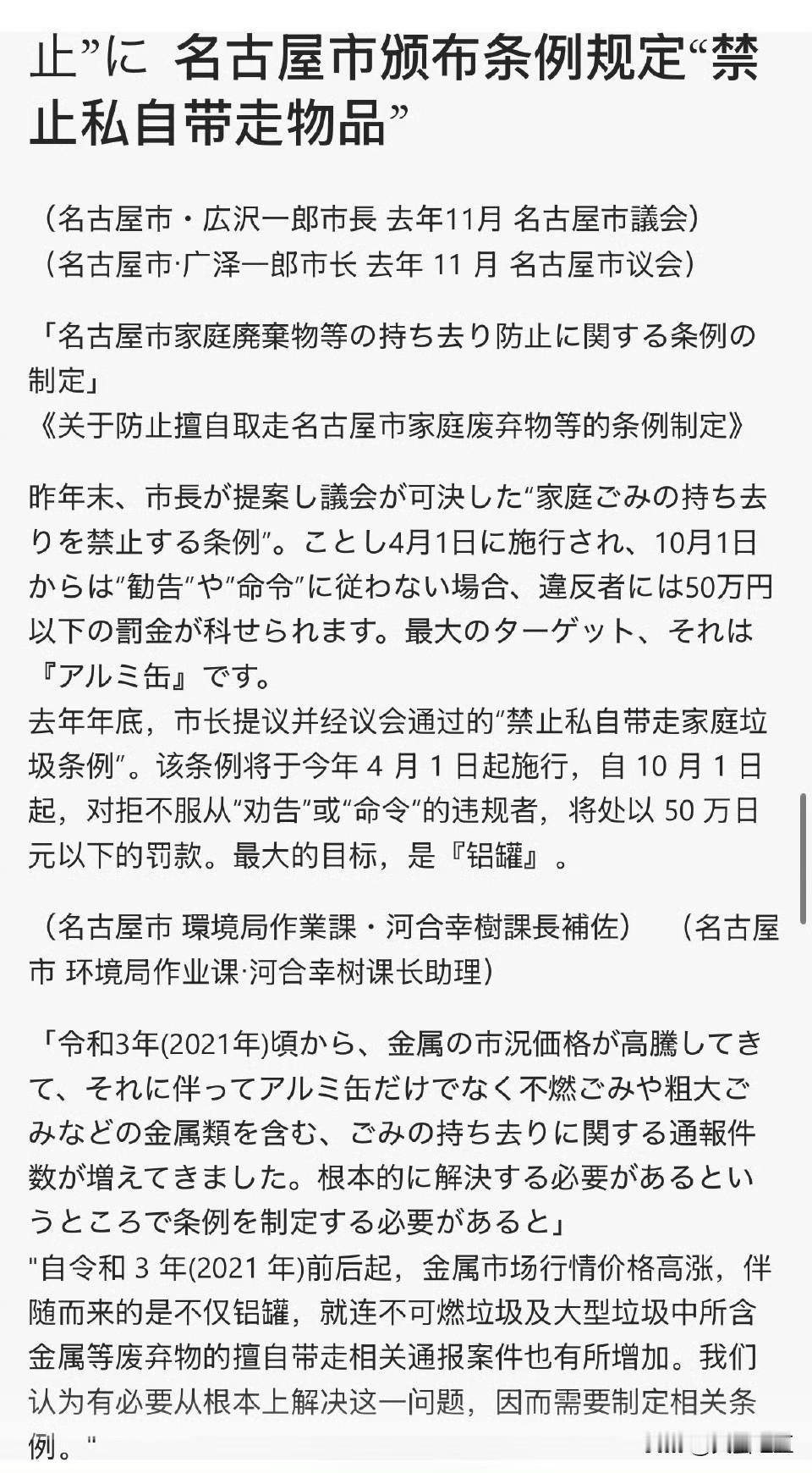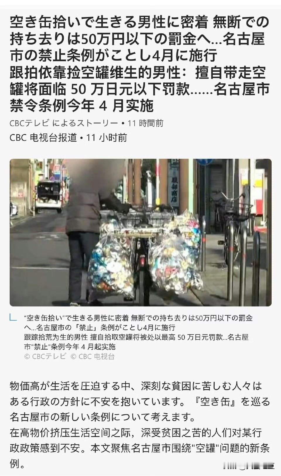 🔻日本逆天新闻一则:今年四月起,名古屋市将禁止“捡垃圾”,违者将处以 50 万日元以下的罚款。 🔻理由是:这些生活垃圾(尤其是易拉罐)是名古屋市政府的收入。 🔻日本无家可归者说:“我们流浪汉怎么可能付得起(罚款)啊。我们一无所有,就靠这些罐子糊口……” 🔻via CBC电视台 🔻日本的斩杀线追上来了?名古屋事件
