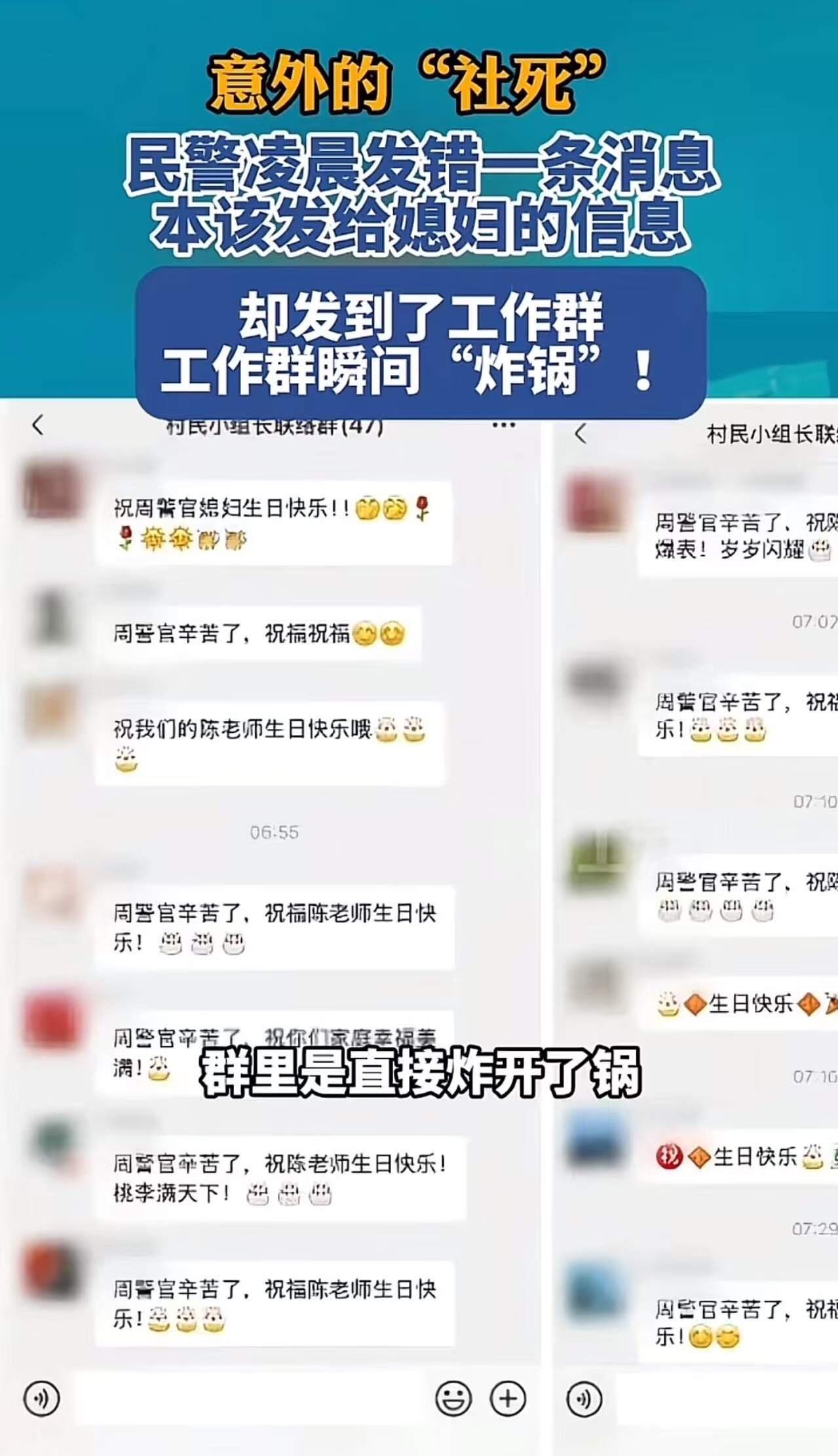意外的“社死”!凌晨,民警给老婆发消息,却不小心发错到工作群,工作群瞬间“炸锅”! 事情发生在云南保山明光边境派出所,民警周晓强的妻子“陈老师”生日那天,他原本计划在零点准时送上祝福。 然而,谁曾想到,一条简单的祝福短信,竟引发了一场意想不到的“社死”现场。凌晨时分,周晓强正沉浸在对妻子深深的爱意中,打算用一段温馨的话语表达自己的心意。可谁料,手一滑,那个“发给老婆”的消息,却不小心发到了工作群里。 瞬间,屏幕上的对话像炸开了锅一样。“这是在干嘛?周队长的私事?哈哈哈!”“难得看到他这么浪漫的一面,结果变成了全体警员的笑料。”……群里的笑声、调侃声像潮水般涌来,直击他那颗紧绷的心。更令人尴尬的是,消息中还夹杂着一些“祝老婆生日快乐”的字样,明显是私人情感,却被群里的同事们看得一清二楚。 这突如其来的“社死”瞬间,让周晓强脸都红了。作为一名执法者,他一向端庄严肃,工作中雷厉风行,赢得了不少同事的尊敬。而此刻,他在朋友圈里变成了“段子手的主角”。更别说,平日里那些严肃认真的形象,此刻仿佛在一夜之间崩塌。 然而,这一事件也让人忍不住深思:在这个信息爆炸、社交无所不在的时代,个人隐私的界限究竟在哪里?一条简单的祝福短信,怎么会让一个普通的工作日变成全民“调侃”的焦点?也许,正是我们平时太过在意“完美形象”,忽略了人性的真实与脆弱。 更令人感慨的是,事情的转机也在悄然发生。事后,周晓强没有选择逃避或躲避,他坦然面对,主动向同事们道歉,还幽默地表示:“以后发短信要三思而后行,别再把私事误发工作群啦!”这一份坦率与幽默,赢得了众人的理解和尊重。 这件事情告诉我们:生活中难免会有“失误”的瞬间,重要的是我们如何面对自己的一时失误。正能量的态度、坦然的心态,或许比任何完美的形象都更有价值。我们每个人都在不断地犯错、成长,关键在于能否从中汲取教训,变得更真实、更坚强。 所以,下次当你不小心“发错消息”的时候,不妨学学周晓强,用坦然和幽默去化解尴尬。毕竟,生活本就是一场不断“出错”的修行,而我们,都是在错误中不断成长的勇者。社恐崩溃瞬间