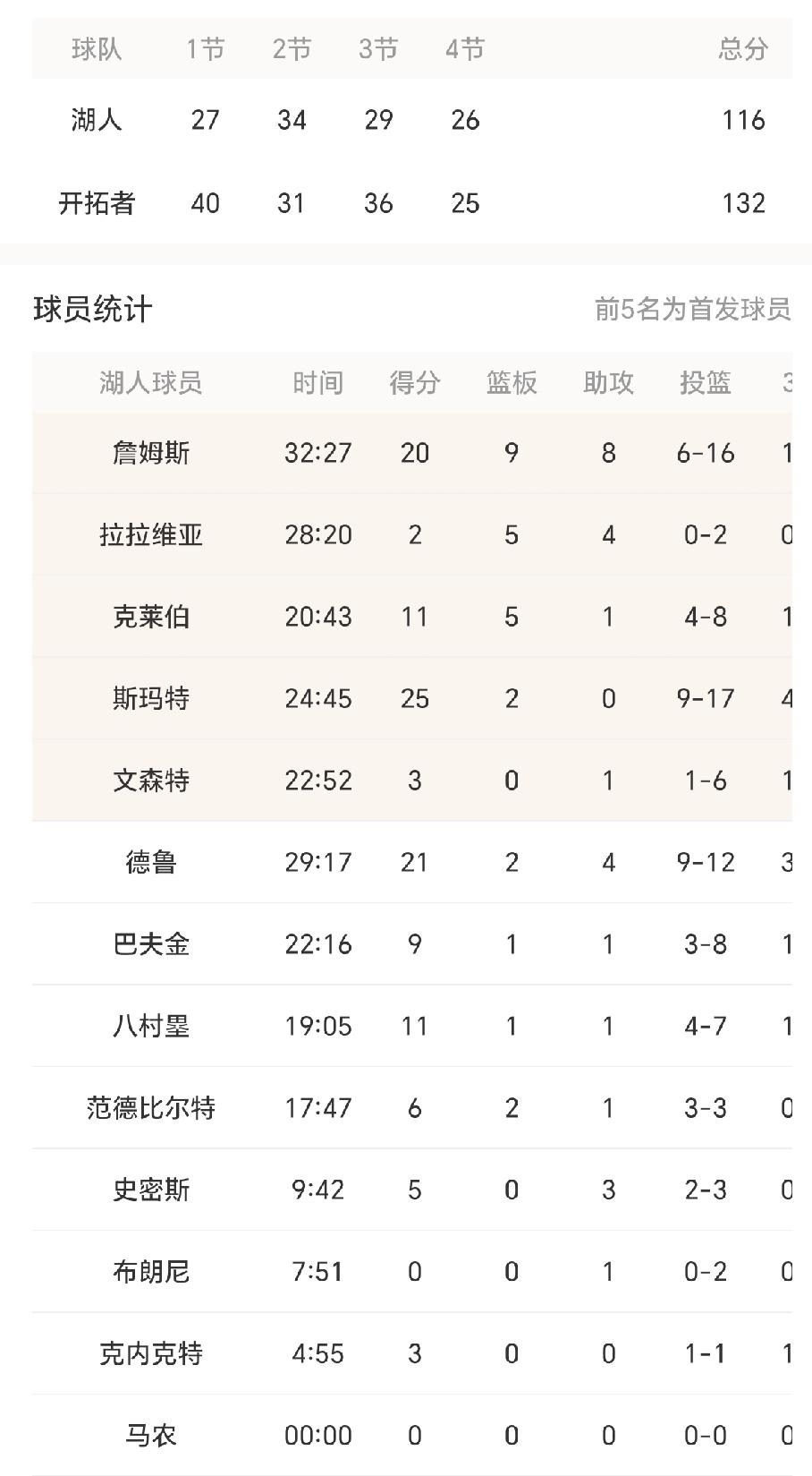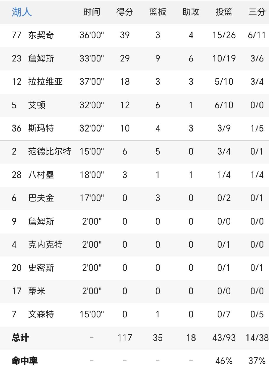 湖人教练组:詹姆斯,你单核带队,不要让球迷失望啊! 湖人管理层:老詹啊,你还行吗? 里夫斯和东契奇伤缺,湖人就没想过要赢,果然如愿116-132不敌开拓者,惨遭两连败。 上一场比赛,湖人主场不敌黄蜂,净输18分。 有意思的是,文森特出场15分钟,7投0中,一分没得。今天雷迪克把文森特提上首发,出场23分钟,6投1中,怒砍3分。 范德比尔特上一场比赛4中3,今天继续替补上场,3投3中。 轮换阵容,不是谁状态好就上谁吗?教练组就是信任文森特啊! 今天的比赛,八村塁也很少和詹姆斯同时在场,看过比赛的都知道,詹姆斯在场上那种无力感,好无奈! 难道真的如网友说的那样,就是要让詹姆斯输球来证明他已经老了,已经无法独自带队获得胜利? 是该离开了!