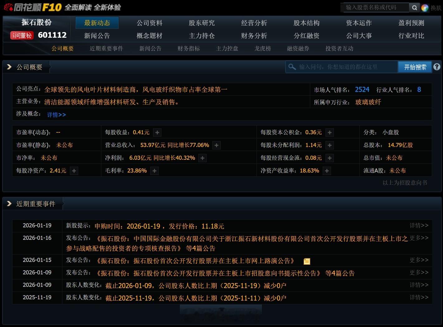 【1月19日新股申购】1只申购振石股份 主营清洁能源领域纤维增强材料研发、生产及销售,全球领先的风电叶片材料制造商,风电玻纤织物市占率全球第一。 正常申购就好~猫说新股