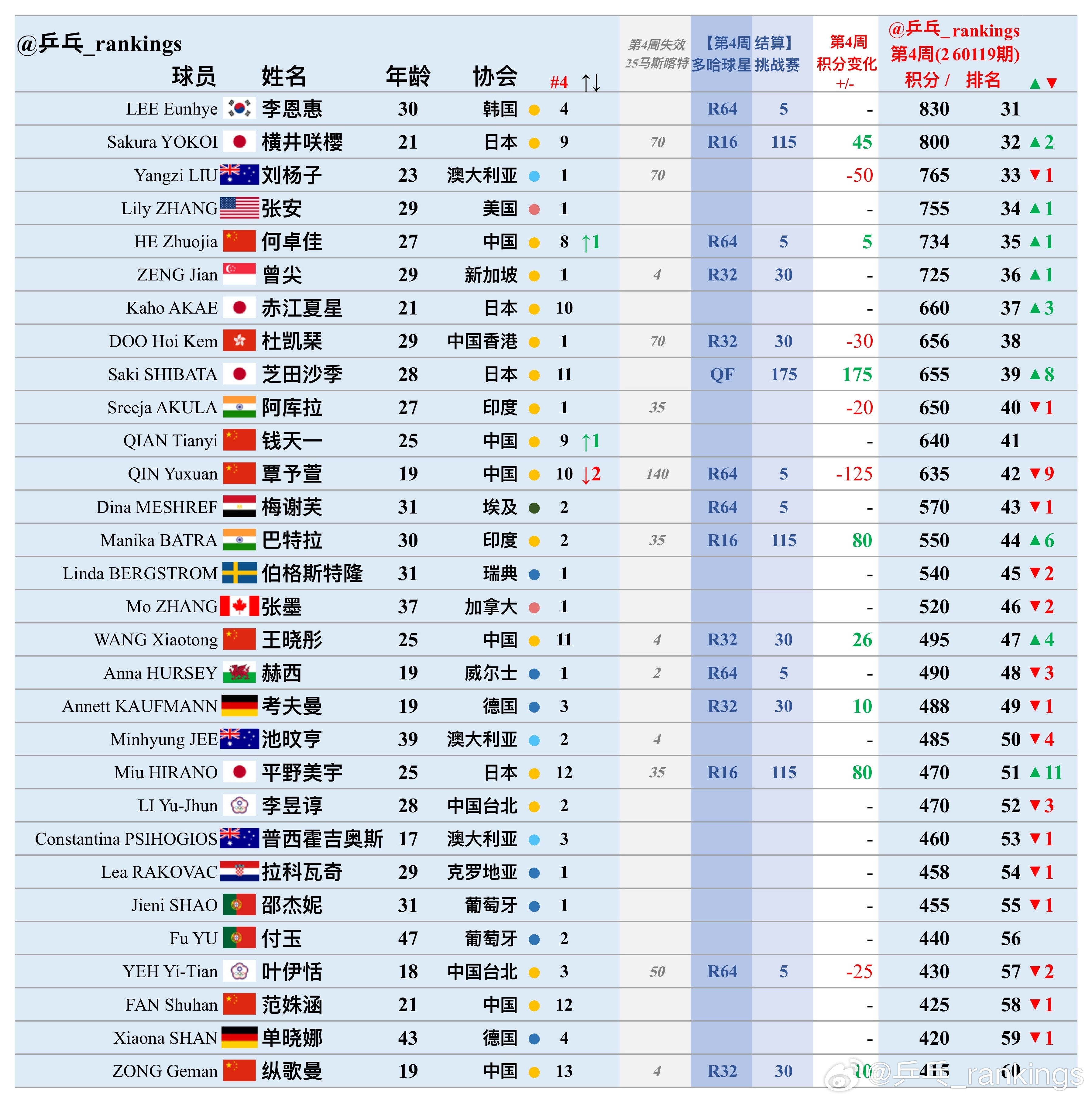第4周世排积分变化(20260119期)【女单】🔺本周结算• WTT球星挑战赛多哈站2026🔻本周失效• WTT常规挑战赛马斯喀特站2025• WTT突尼斯青少常规、青少球星赛2025【积分排名数据仅供参考,以最终实际为准】