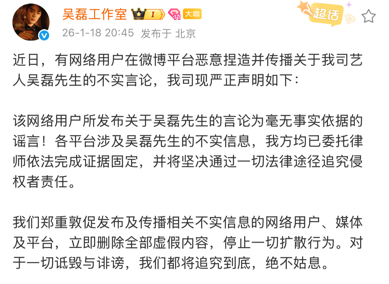 吴磊工作室发声明了