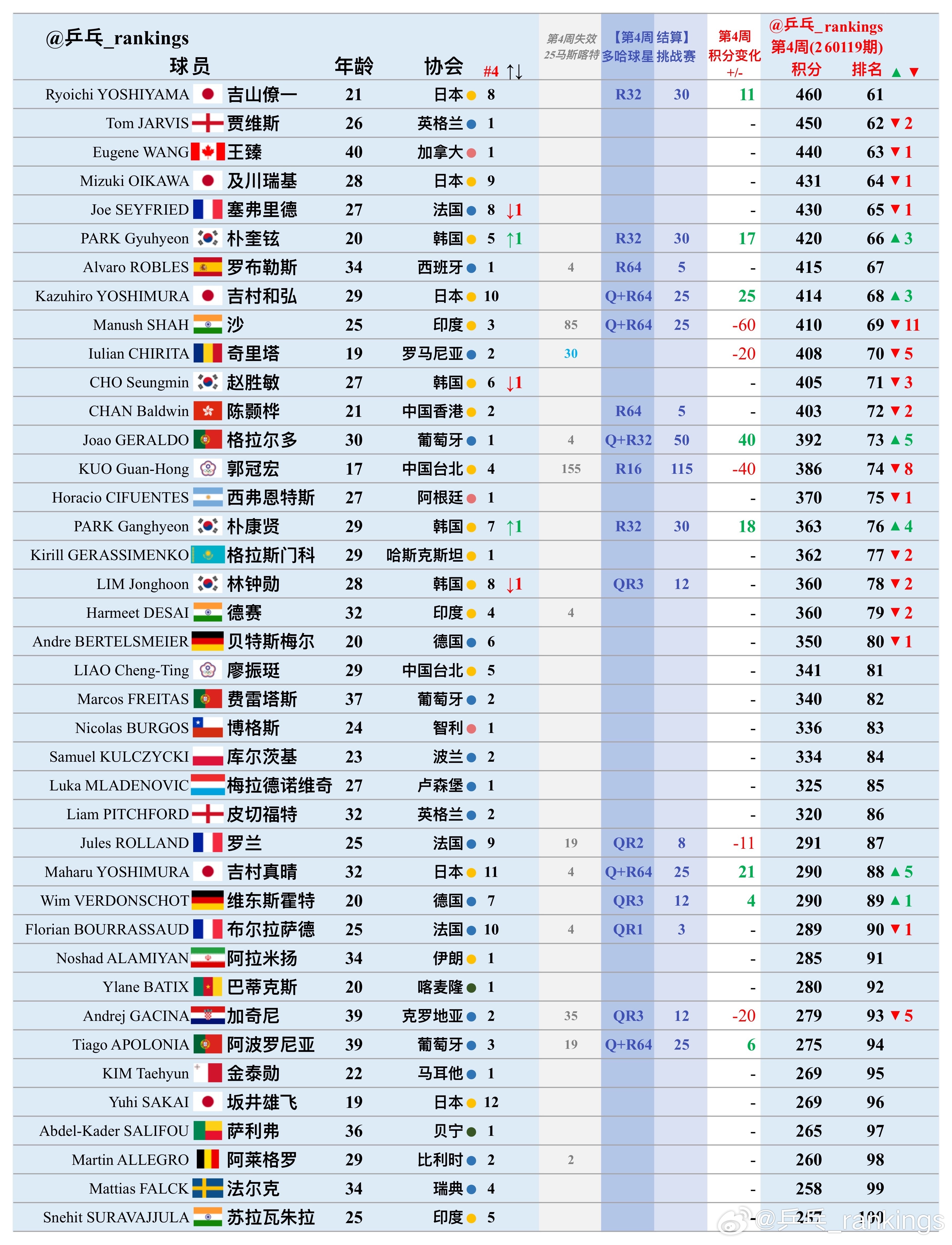 第4周世排积分变化(20260119期)【男单】🔺本周结算• WTT球星挑战赛多哈站2026🔻本周失效• WTT常规挑战赛马斯喀特站2025• WTT突尼斯青少常规、青少球星赛2025【积分排名数据仅供参考,以最终实际为准】