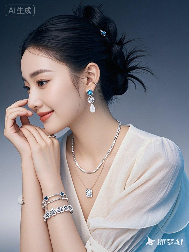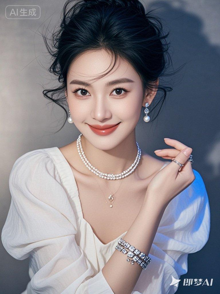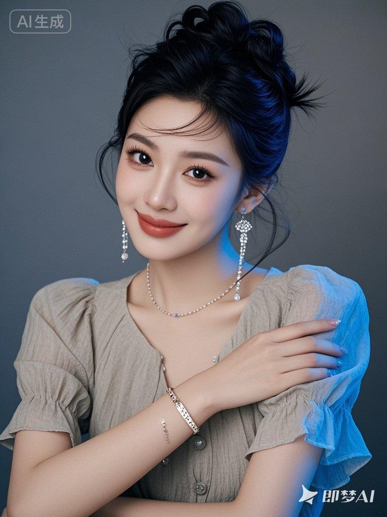 一位年轻漂亮的美女,身穿时尚棉麻雪纺衫,戴着耳环、项链和精质手链,有着精致妆容和蓬松盘发,温和微笑