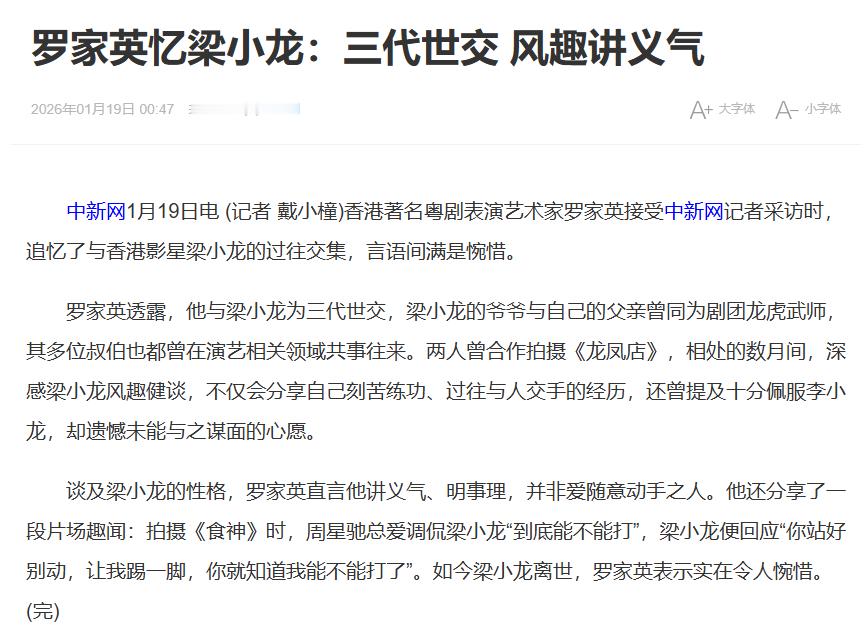 【罗家英追忆梁小龙】梁小龙遗憾没能与李小龙谋面著名功夫影星梁小龙1月14日逝世,享年77岁梁小龙本想隐瞒死讯。香港著名粤剧表演艺术家接受中新网记者采访时,追忆了与香港影星梁小龙的过往交集。他透露,自己与梁小龙为三代世交,梁小龙的爷爷与自己的父亲曾同为剧团龙虎武师,其多位叔伯也都曾在演艺相关领域共事往来。两人曾合作拍摄《龙凤店》,相处的数月间,深感梁小龙风趣健谈,不仅会分享自己刻苦练功、过往与人交手的经历,还曾提及十分佩服李小龙,却遗憾未能与之谋面的心愿。 (记者 戴小橦)