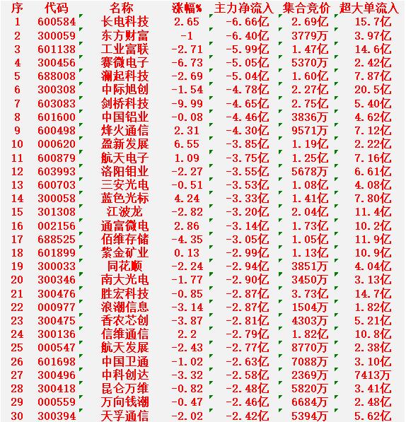 1月19日开盘45分钟,主力“卖出的 ”30名单! 长电科技:净流出 6.66亿元 东方财富:净流出 6.40亿元 工业富联:净流出 5.99亿元 赛微电子:净流出 5.05亿元 澜起科技:净流出 5.04亿元