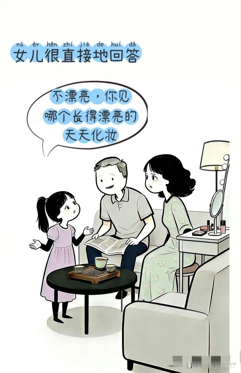 逗你笑:妈妈化完妆后问:我漂不漂亮?女儿:不漂亮。妈妈生气,女儿继续戏弄:别生气,谁长这样心里都不好受。爸爸:女儿不会说话但诚实