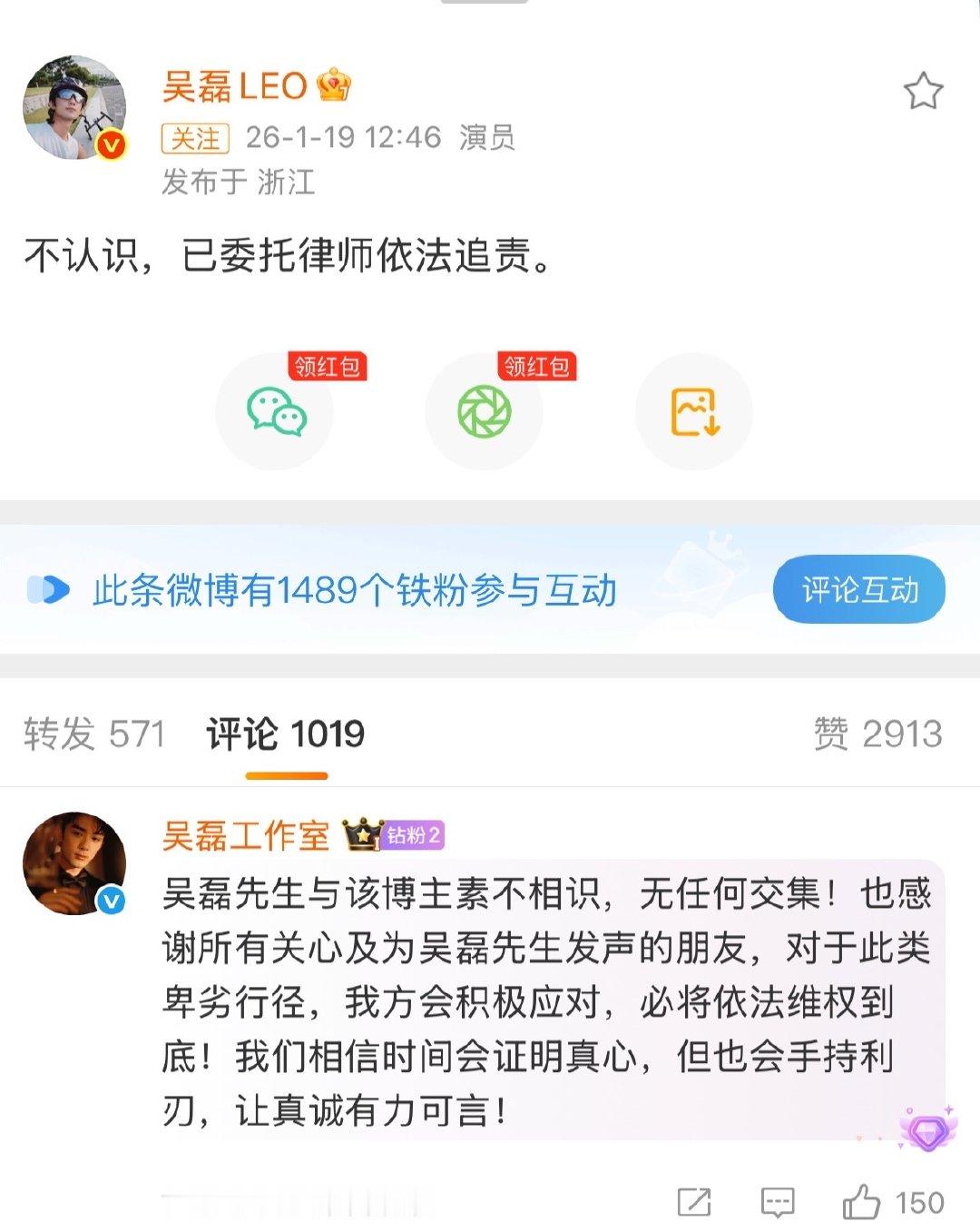 吴磊本人回复不认识 吴磊本人也来澄清啦,回复不认识,已委托律师 吴磊