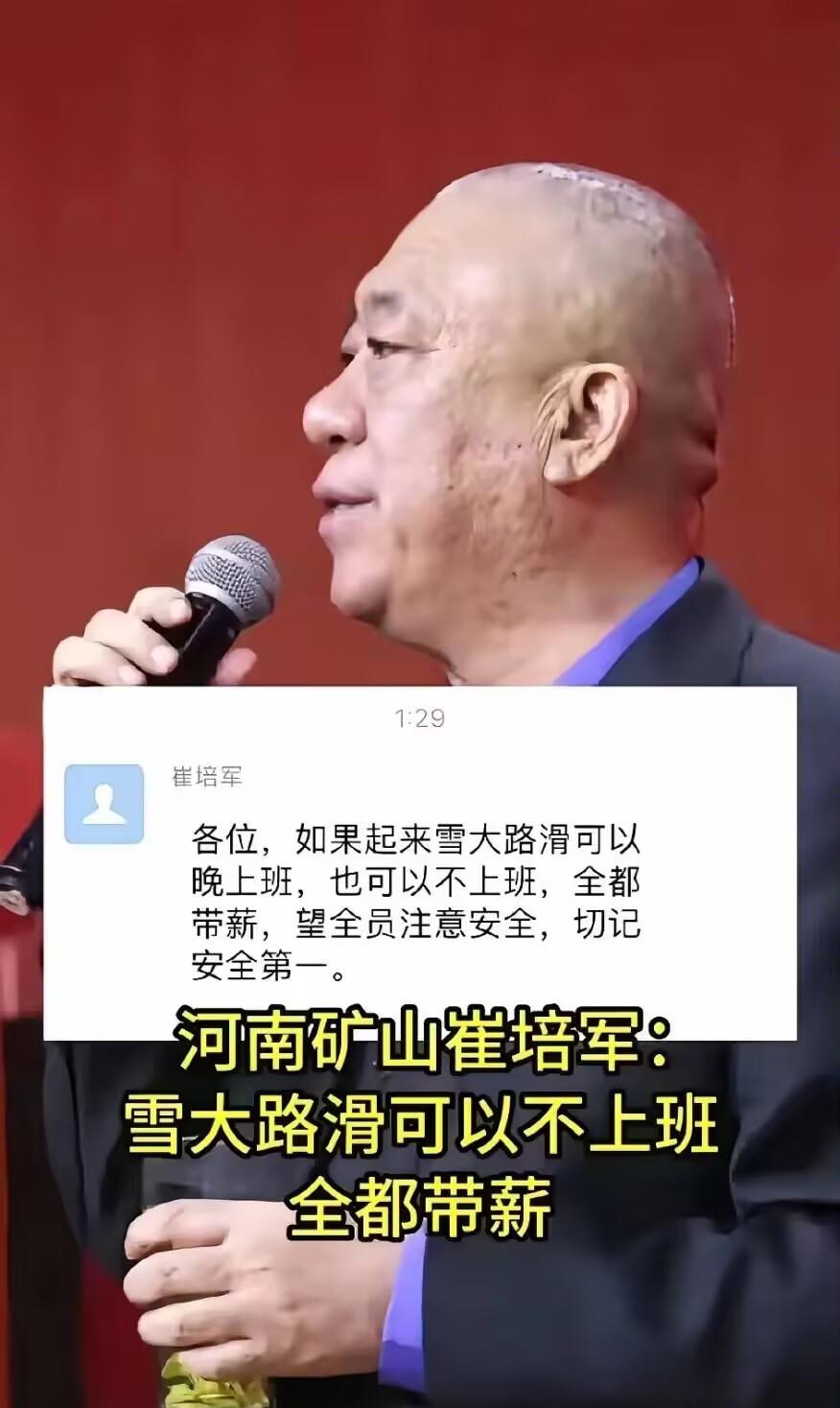 河南今天有中雪到大雪。河南矿山老总崔培军前一天在公司领导群里边发话:“各位!如果起来雪大路滑,员工可以晚来上班,也可以不上班,全部带薪。望全员注意安全,切记安全第一!” 这份通知在网上刷屏时,没人觉得是临时作秀——了解崔培军的人都知道,这只是他众多暖心操作里的常规操作。这位老板的福利哲学,从来都是把员工的安全感放在第一位。 2025年暖冬,他直接安排400多斤新鲜羊肉,办起第五届火锅节,四千多名员工管够吃,连一线装卸司机都能到场解馋。 2025年麦收季更实在,员工说想要800元补贴,他直接加到1000元,还放话“收麦是大事,必须带薪”,顺带塞满粽子、啤酒的福利大礼包。 家有学龄儿童的员工能延后返岗,女员工妇女节能领800元现金+鲜花,员工买房结婚,他不仅给无息借款,还会主动多塞5万元。 他连续13年组织员工父母免费旅游,2025年包下77辆大巴,带四千多位老人赴扬州、杭州等地开启6日游,累计参与人次超2.4万。 2024年年会上,他拿出纯利润里的1.7亿发年终奖,现场6100万现金堆成“钱山”,单人最高领500万,外省员工也能足额领取。 他常说“员工就像自己的孩子,发钱给他们永远不亏”,这话藏着最朴素的经营逻辑——员工安心,才能全心投入工作。 河南矿山近三年员工流失率不足3%,远低于行业平均水平,不少老员工直言,跟着崔总干,就算有高薪挖人也舍不得走。 反观有些企业,一边喊着“家文化”,一边让员工无偿加班,连基本休假都要打折扣。这样的企业,再华丽的口号也留不住人心。 崔培军的走红,本质上是职场人对“好雇主”的集体期待。当福利不再是稀缺品,当关怀成为常态,企业和员工才能实现真正的双赢。 河南矿山已从6人的小工棚,长成年产值103亿、产品出口122个国家的行业龙头,2024年产销量较上年增长近万台。 很多中小企业抱怨做不起员工福利,崔培军的做法却证明,关怀不在钱多钱少,而在是否真的把员工放在心上。 不用搞复杂的激励体系,不用喊空洞的口号,把员工当家人一样对待,自然能收获死心塌地的追随。这道理简单,却没多少企业能真正做到。 好的企业,从来都懂得双向奔赴。你给员工足够的尊重和保障,员工自然会用敬业和忠诚回报。这才是企业长久发展的核心密码。 各位读者你们怎么看?欢迎在评论区讨论。 崔培军