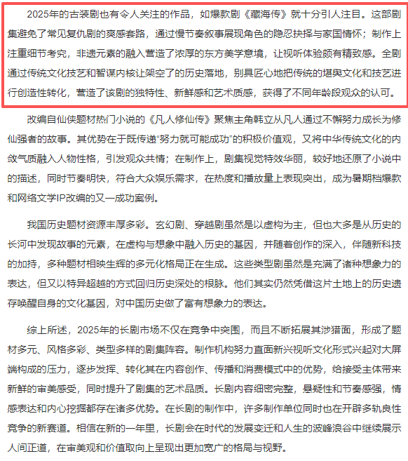【中国艺术报:藏海传避免了复仇剧爽感套路】中国艺术报近日发文“长剧在竞争中突围——从2025年的几部电视剧谈起”,其中特别提到了主演的《藏海传》:2025年的古装剧也有令人关注的作品,如爆款剧《藏海传》就十分引人注目藏海传获得不同年龄段观众的认可。 这部剧集避免了常见复仇剧的爽感套路,通过慢节奏叙事展现角色的隐忍抉择与家国情怀;制作上注重细节考究,非遗元素的融入营造了浓厚的东方美学意境,让视听体验颇有精致感。全剧通过传统文化技艺和智谋内核让架空了的历史落地,别具匠心地把传统的堪舆文化和技艺进行创造性转化,营造了该剧的独特性、新鲜感和艺术质感,获得了不同年龄段观众的认可。