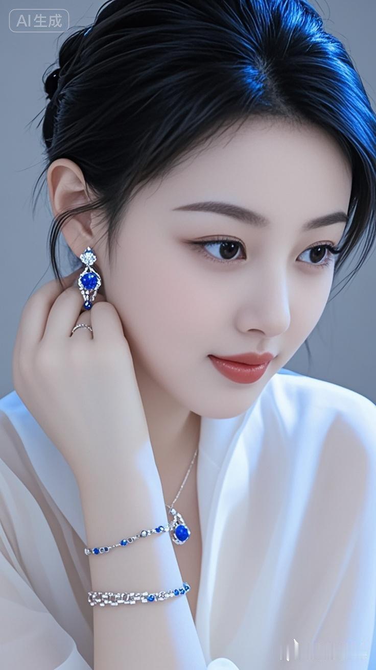 一位年轻漂亮的美女,身穿时尚棉麻雪纺衫,戴着耳环、项链和精质手链,有着精致妆容和