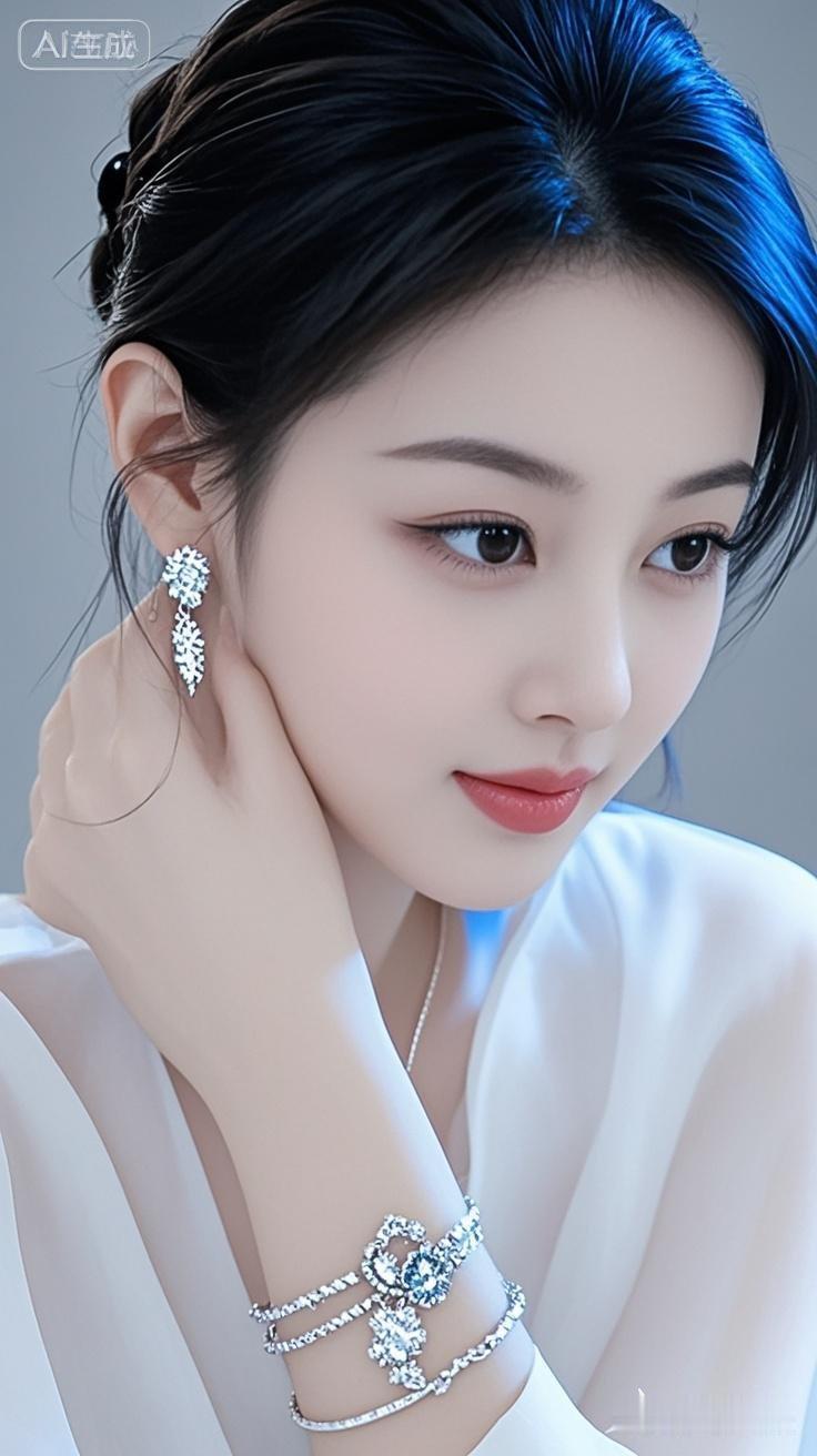 今年冬天的不同一位年轻漂亮的美女,身穿时尚棉麻雪纺衫,戴着耳环、项链和精质手链,有着精致妆容和蓬松盘发,低头温和微笑