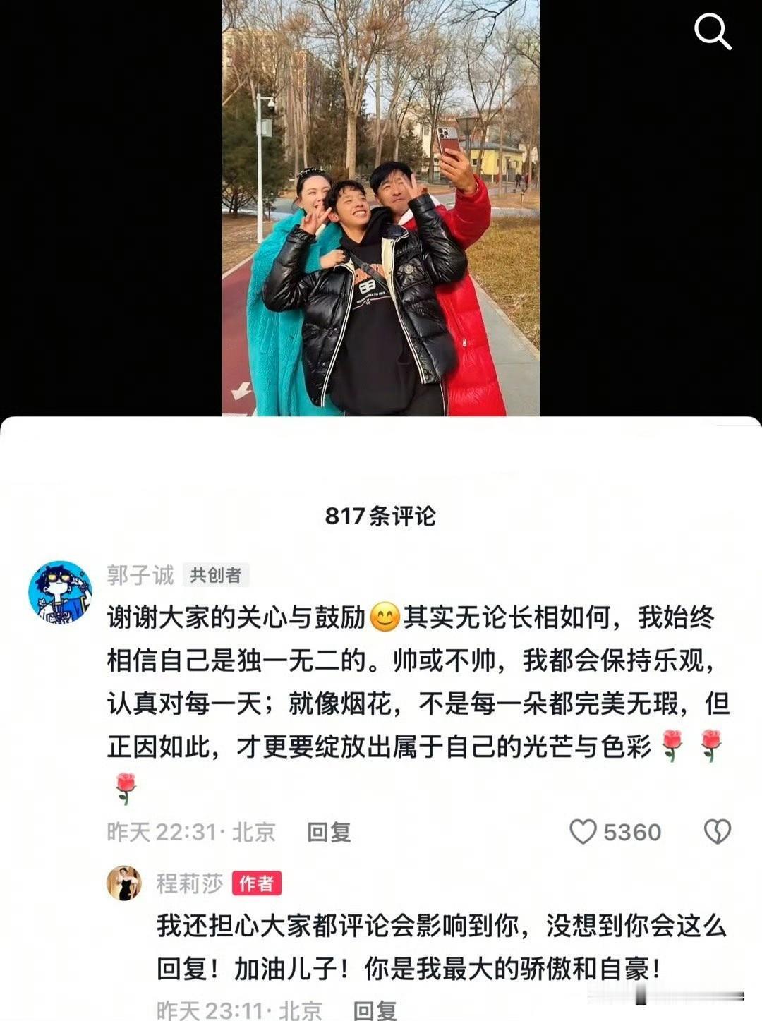 1月19日,郭晓东儿子回应长得不帅 郭晓东老婆程莉莎分享一家三口视频,评论区有人对郭晓东儿子颜值进行点评,郭晓东儿子看到后回应大家,表示无论长相如何,他始终相信自己是独一无二的,帅或不帅,都会保持乐观心态认真对待每一天! 程莉莎看到儿子回复倍感欣慰,直言原本还担心网友的评论会影响到他,没想到他能如此回复,为他加油,直言他是自己的骄傲 星二代的正确打开方式,我觉得郭晓东儿子除了黑了点,其他都还行,笑起来很好看! 郭晓东