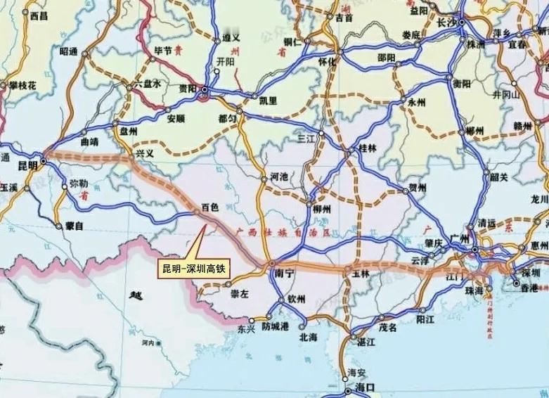 昆明至深圳高铁通道与其说连接西南春城昆明,但更多还是三者共享,对于昆明来说多一条新的高铁东出通道,而对于南宁、广西东部,广东西部地区通往重要,而这一带也是最多去往珠三角工业学习的人口流动区域,而广东也多了一条去往西南地区的抓手,会不会是另外一条“贵广高铁通道”的翻版也不可而知。
