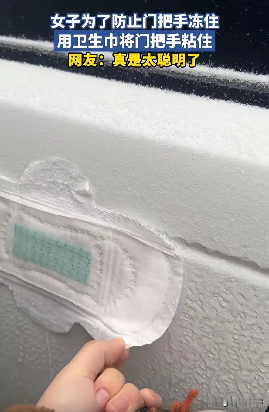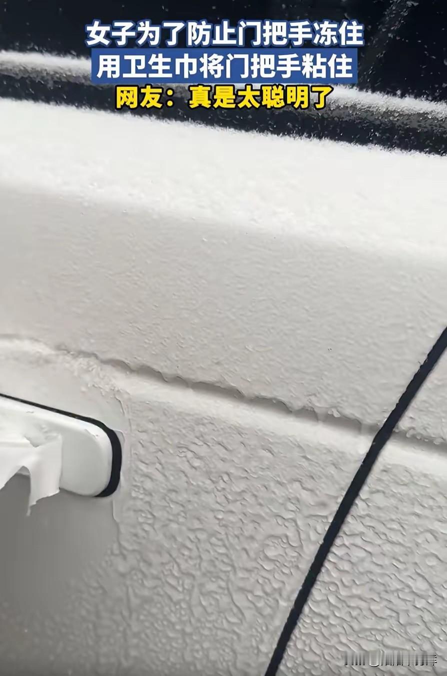 这是真有才!山东,天气降温下雪后,一女子担心车子的隐藏门把手被冻住,灵机一动,从包里掏出一片卫生巾直接粘在门把手上面,没想到效果出奇的好。网友:就是看着有点尴尬 那天山东的雪粒子砸在车窗上,噼里啪啦像小鞭炮。早上出门上班的车主都在骂街,昨晚还好好的车,今早门把手全跟焊死了似的。有人浇热水,结果水刚倒上去就冻成冰壳子;有人拿卡片撬,差点把车漆刮花。 这姑娘站在车边,搓着冻红的手,盯着隐藏式门把手犯愁。她包里除了口红、纸巾,就剩下一片备用的卫生巾。盯着那层绵柔表层,她突然笑了,这不就是现成的防冻罩吗?撕开封条往门把手上一按,黏胶层牢牢贴住,棉面刚好把整个把手裹得严严实实。 等她下班再下楼,别的车主还在跟门把手死磕,她走过去轻轻一撕,卫生巾上结了层薄冰,底下的门把手却干干净净,一按就弹出来。周围几个大哥看得眼睛都直了,有人憋不住笑,有人小声嘀咕,这招是挺好用,但路过的人看见车屁股上贴个这玩意儿,确实有点社死。 其实这事细想挺有意思。我们总给生活用品贴标签,卫生巾就是“女性专属”,防冻得买“汽车专用”。可真到了零下十几度的雪天,谁管什么标签?能解决问题的就是好东西。去年东北有个大爷用尿不湿给电动车电瓶保暖,原理跟这一模一样,都是利用棉层的锁温性和防水性。 说白了,这就是普通人的生存智慧。我们没必要为了“体面”拒绝实用,也不用因为别人的眼光否定自己的应急办法。就像有人用矿泉水瓶当漏斗,用快递盒当收纳箱,本质都是把身边的东西用到极致。 换作是你,零下十几度的雪天,车把手冻住了,包里只有一片卫生巾,你会用吗?