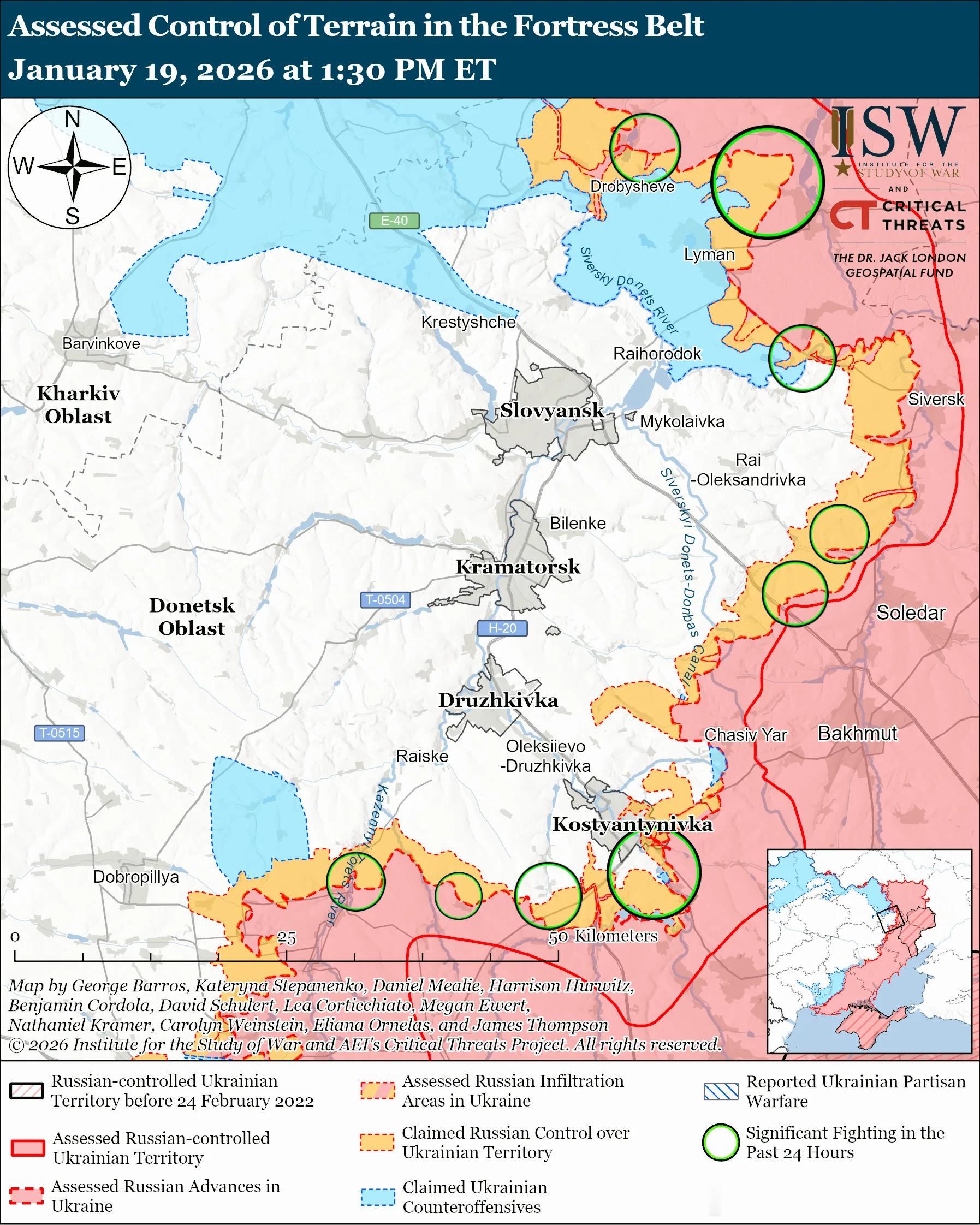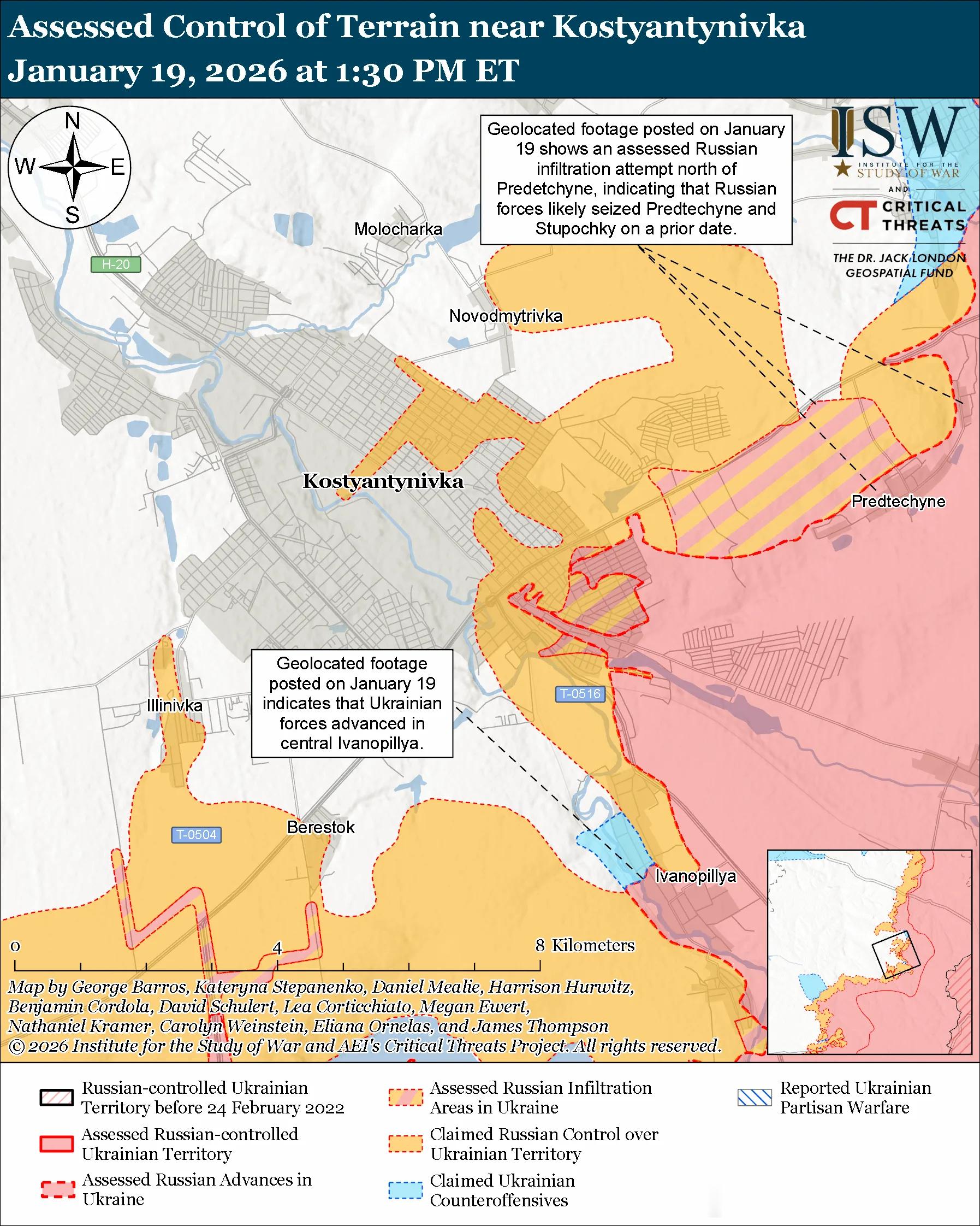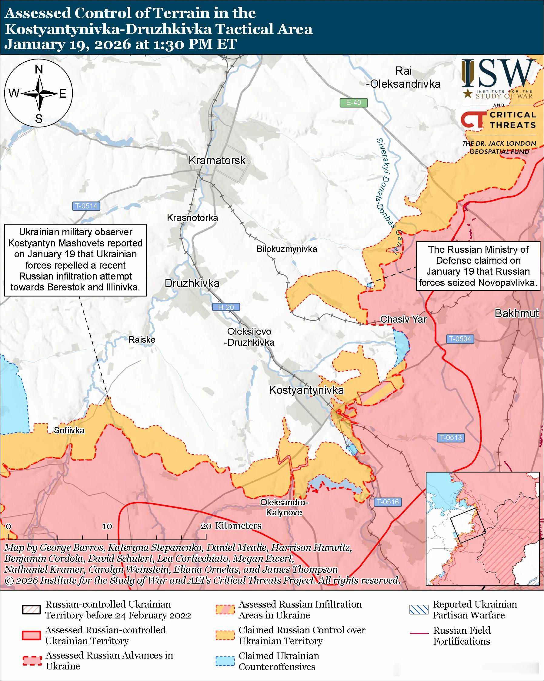俄军主要行动3——顿涅茨克州俄军目标:占领顿涅茨克州全境,并向第聂伯罗彼得罗夫斯克州推进。俄军最近向斯拉维扬斯克方向推进。评估俄军推进情况:1月19日发布的地理定位视频显示,俄军近期向莱曼以东推进。乌克兰军事观察员马绍韦茨于1月15日报告称,俄军向扎里奇内(莱曼以东)以西约5公里处推进,1月19日发布的地理定位视频显示俄军在扎里奇内西北部活动。因此来自乌克兰和俄罗斯方面的现有文字和视频证据表明,俄军可能已占领米尔内(莱曼东北部)、扎里奇内、扬波利夫卡和托尔斯克(均位于莱曼以东),并在此前已向扎里奇内西部和西南部的田野推进。随着更多信息的获取,ISW将继续完善和更新其评估。未经证实的说法:一位俄罗斯军事博主声称,俄军在普里什布(莱曼西北部)附近推进。1月18日和19日,俄军在莱曼附近、莱曼西北部的斯塔夫基和新谢利夫卡附近、莱曼东北部的科洛迪亚齐和扎里奇内附近、莱曼东南部的迪布罗瓦、奥泽尔内和扬皮尔附近、斯拉维扬斯克东北部的扎基特涅附近、斯拉维扬斯克东部的西韦尔斯克和里兹尼基夫卡附近以及斯拉维扬斯克东南部的帕泽诺附近和赖-奥列克桑德里夫卡方向发动了进攻。作战序列:据报道俄第7摩步旅(第3合成集团军[CAA],南部军区[SMD])正在锡韦尔斯克和扎基特涅附近作战。鲁比孔先进无人技术中心的无人机操作员和第752摩步团(第3摩步师,第20合成集团军,莫斯科军区[MMD])的侦察兵正在莱曼方向作战。乌克兰军队最近向科斯特扬季尼夫卡-德鲁日基夫卡战术区推进。评估乌克兰军队的推进情况:1 月 19 日发布的地理定位视频显示,乌克兰军队在伊万诺皮利亚中部(科斯蒂安蒂尼夫卡以南)取得了进展。评估俄军的进展:最近大量的地理定位视频表明,俄军很可能占领了斯图波奇基和普列德切涅(均位于科斯蒂安蒂尼夫卡以东)。评估俄军渗透:1 月 19 日发布的地理定位视频显示,一名俄军在普列德捷奇涅以北活动,ISW 评估认为这是一次渗透任务。未经证实的说法:俄罗斯国防部声称,俄军占领了新巴甫洛夫卡(位于德鲁日基夫卡西南)。一位俄罗斯军事博主声称,俄军向伊利尼夫卡(位于科斯蒂扬蒂尼夫卡以西)推进,并沿着新马尔科韦附近的西维尔斯基顿涅茨-顿巴斯运河(位于科斯蒂扬蒂尼夫卡东北)。俄军在科斯特扬季尼夫卡附近发动进攻;科斯蒂安提尼夫卡 (Kostyantynivka) 东北方向迈斯克 (Maiske) 和马尔科夫 (Markove) 方向;从Kostyantynivka以北前往Pryvillya和Virolyubivka;科斯蒂安提尼夫卡 (Kostyantynivka) 以南,靠近克莱班-比克 (Kleban-Byk)、谢尔比尼夫卡 (Shcherbynivka) 和伊万诺皮利亚 (Ivanopillya) 并朝别列斯托克 (Berestok) 方向;位于 Kostyantynivka 东南部,靠近 Oleksandro-Shultyne; Kostyantynivka 西南部,靠近 Yablunivka 和 Stepanivka;科斯佳提尼夫卡 (Kostyantynivka) 以西,朝向伊利尼夫卡 (Illinivka); Druzhkivka以南,靠近Rusyn Yar;从 Druzhkivka 西南部前往 Novopavlivka、Torske 和 Sofiivka。据报道俄军已将科斯蒂安蒂尼夫卡-德鲁日基夫卡战术区域内的作战部队拆分为两个战术群:捷尔任斯克(托列茨克的俄语名称)战术群和巴赫穆特战术群。乌克兰军事观察员科斯蒂安廷·马绍韦茨表示,捷尔任斯克战术群和巴赫穆特战术群计划分别从南部和东南部完成对科斯蒂安蒂尼夫卡的占领,并向克拉马托尔斯克推进。马绍韦茨报告称,俄军指挥部指示捷尔任斯克战术群从科斯蒂安蒂尼夫卡西侧推进,占领该市西半部,而巴赫穆特战术群则将从东侧发起进攻。马绍韦茨指出,捷尔任斯克战术群由战区内不同部队群作战指挥下的不同作战部队组成,包括:第3装甲团、第8装甲团、第3装甲连(均隶属于南方部队群作战指挥)、第49装甲团、第58装甲团(均隶属于第聂伯河部队群作战指挥)和第51装甲团(隶属于中央部队群作战指挥);以及额外的海军陆战队和俄罗斯陆军战斗预备队(BARS)部队。马绍韦茨表示,巴赫穆特战术群的兵力明显较少,包括隶属于第6摩步师(第3集团军)作战指挥下的俄罗斯动员预备队的三个团、第6摩步师的一个坦克团和第3集团军的一个旅。马绍韦茨报告称,俄军指挥部于 2025 年 12 月将第 70 摩步师(第 18 集团军)重新部署到科斯蒂安蒂尼夫卡-恰西夫亚尔地区,以取代于 2025 年秋季重新部署到赫尔松州的第 98 空降师(VDV)。作战序列:俄第70摩步师的无人机操作员正在查西夫亚尔方向作战。第4摩步旅(第3集团军)的无人机操作员正在科斯蒂安蒂尼夫卡和伊万诺皮利亚打击乌克兰军队。第238炮兵旅(第8集团军)的巡飞弹操作员正在赖斯克和新谢利夫卡(均位于德鲁日基夫卡西南)附近打击乌克兰军队。第68独立侦察营(第20摩步师,第8集团军)的无人机操作员正在尼古拉皮利亚(位于德鲁日基夫卡以南)附近打击乌克兰军队。1月19日俄军继续在多布罗皮利亚战术区开展进攻行动,但并未取得进展。1 月 18 日和 19 日,俄军从多布罗皮利亚东北方向向库切里夫亚尔发动进攻,从多布罗皮利亚东部向托列茨克方向向新顿巴斯发动进攻,从多布罗皮利亚东南部向扎波维德涅发动进攻。1月19日俄军继续向波克罗夫斯克方向发起进攻,但并未取得进展。1月18日和19日俄军在波克罗夫斯克附近及城内发动进攻;在波克罗夫斯克西北部格里申附近;在波克罗夫斯克北部罗丁斯克附近;在波克罗夫斯克东北部扎特绍克和切尔沃尼(克拉斯尼)莱曼附近;在波克罗夫斯克东部米尔诺赫拉德附近;