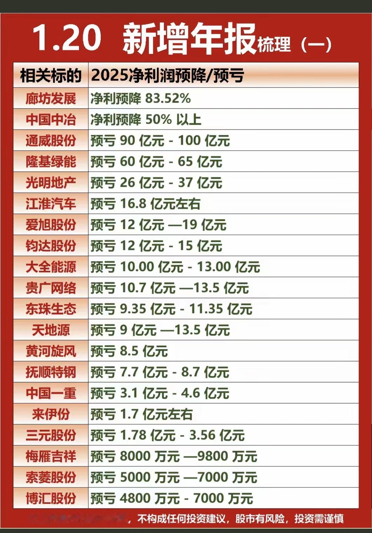 1.20周二 最新:44家公司披露年报业绩 28家预降或亏损,16家公司年报盈利!