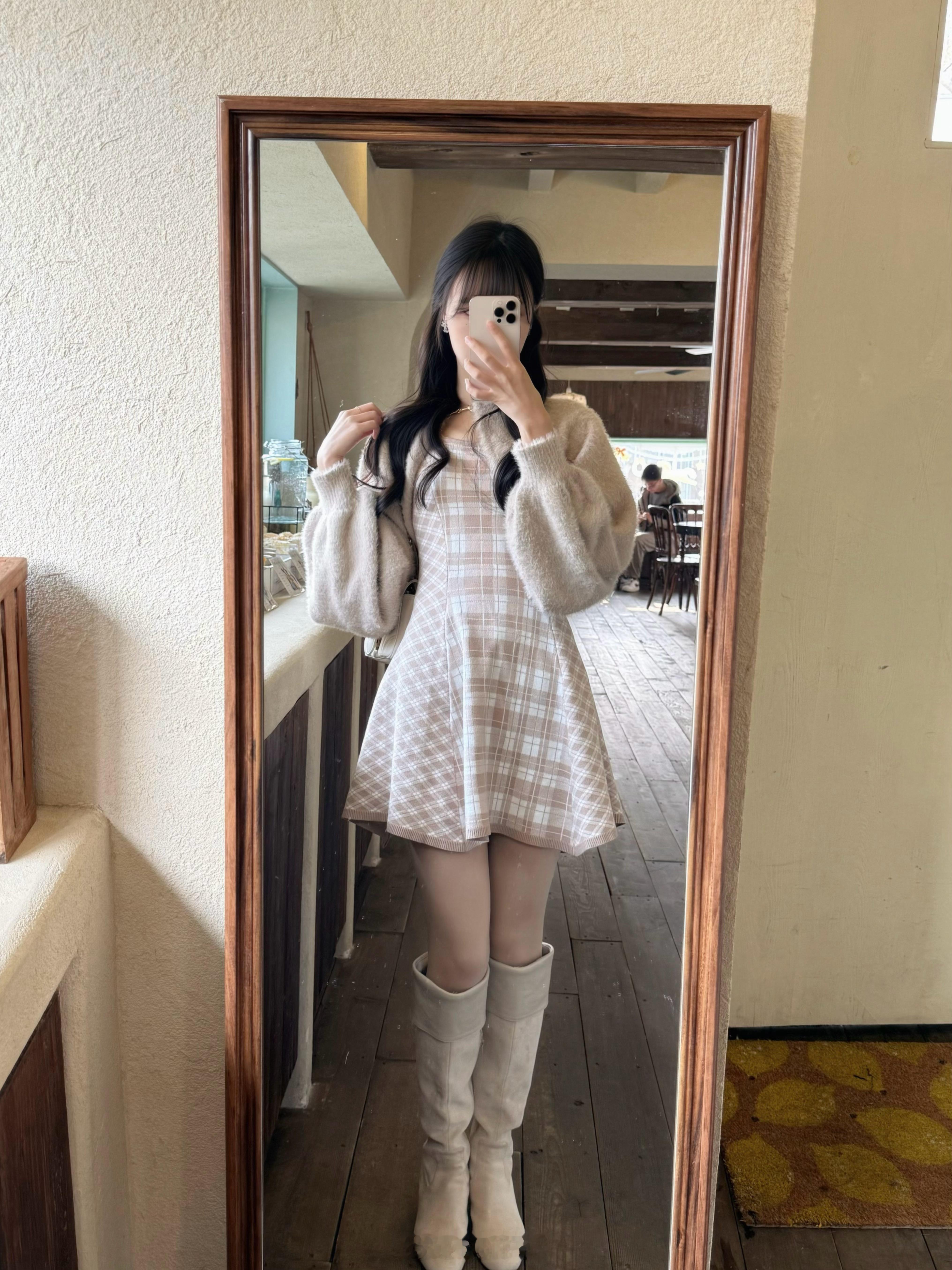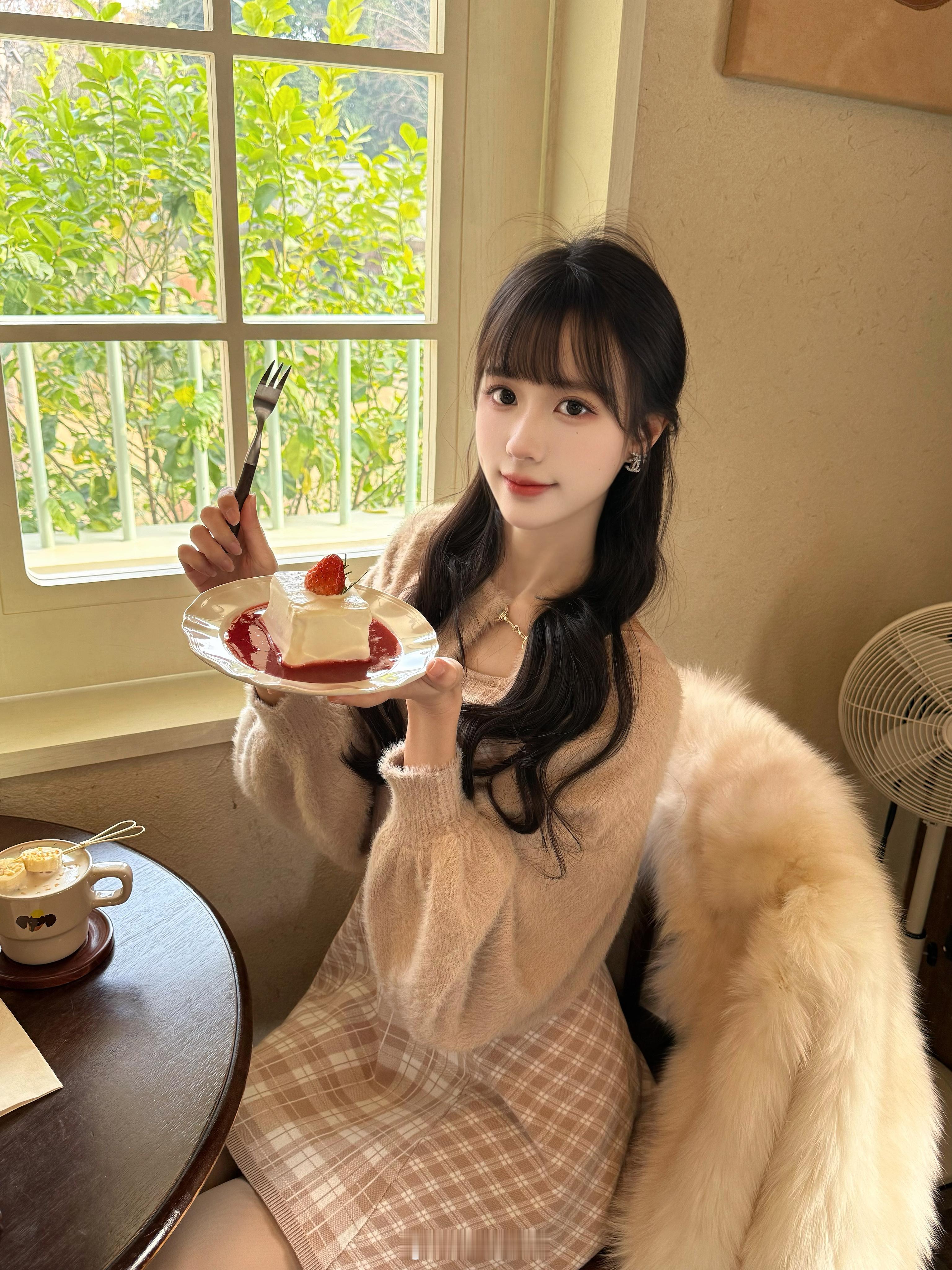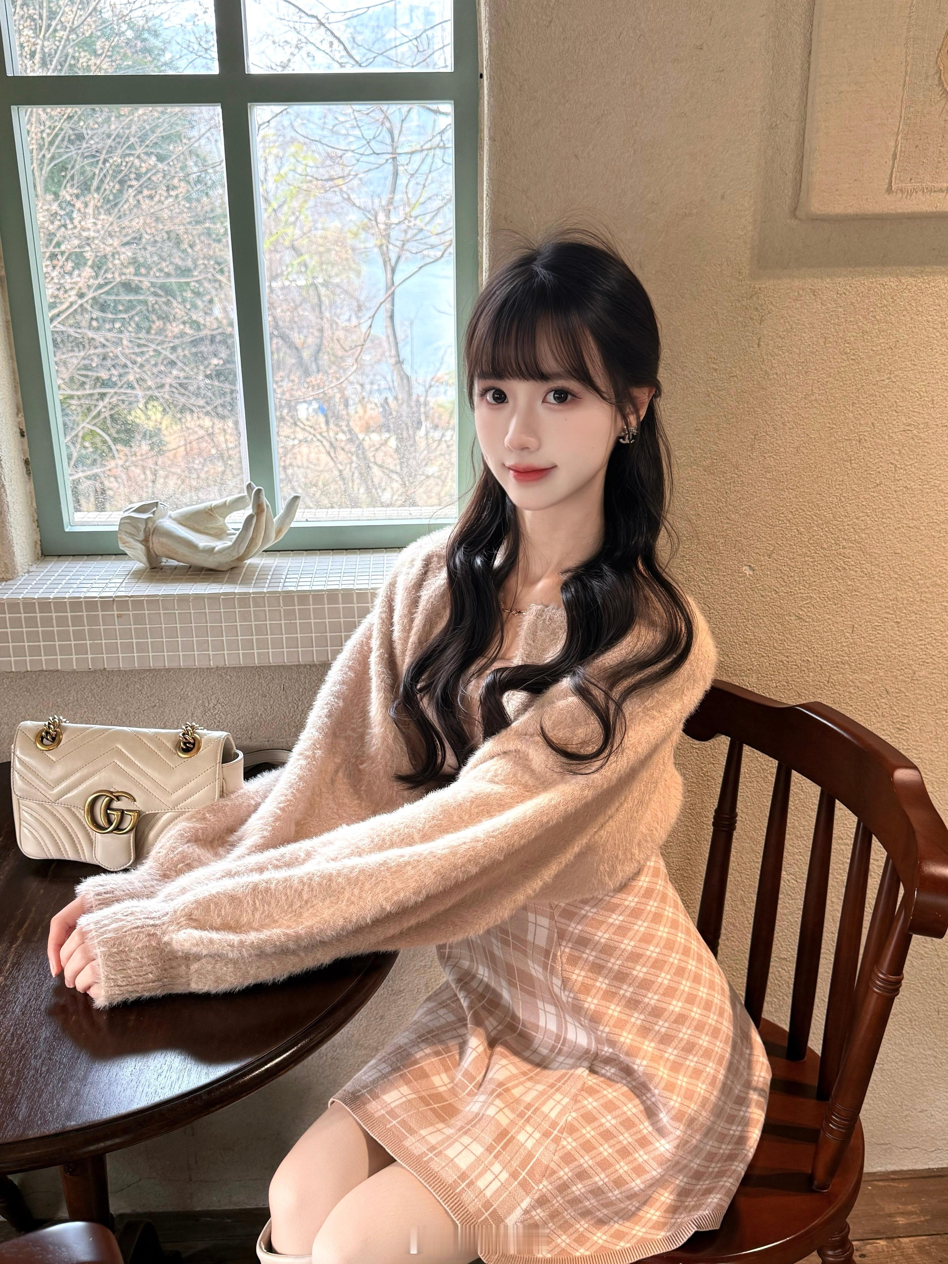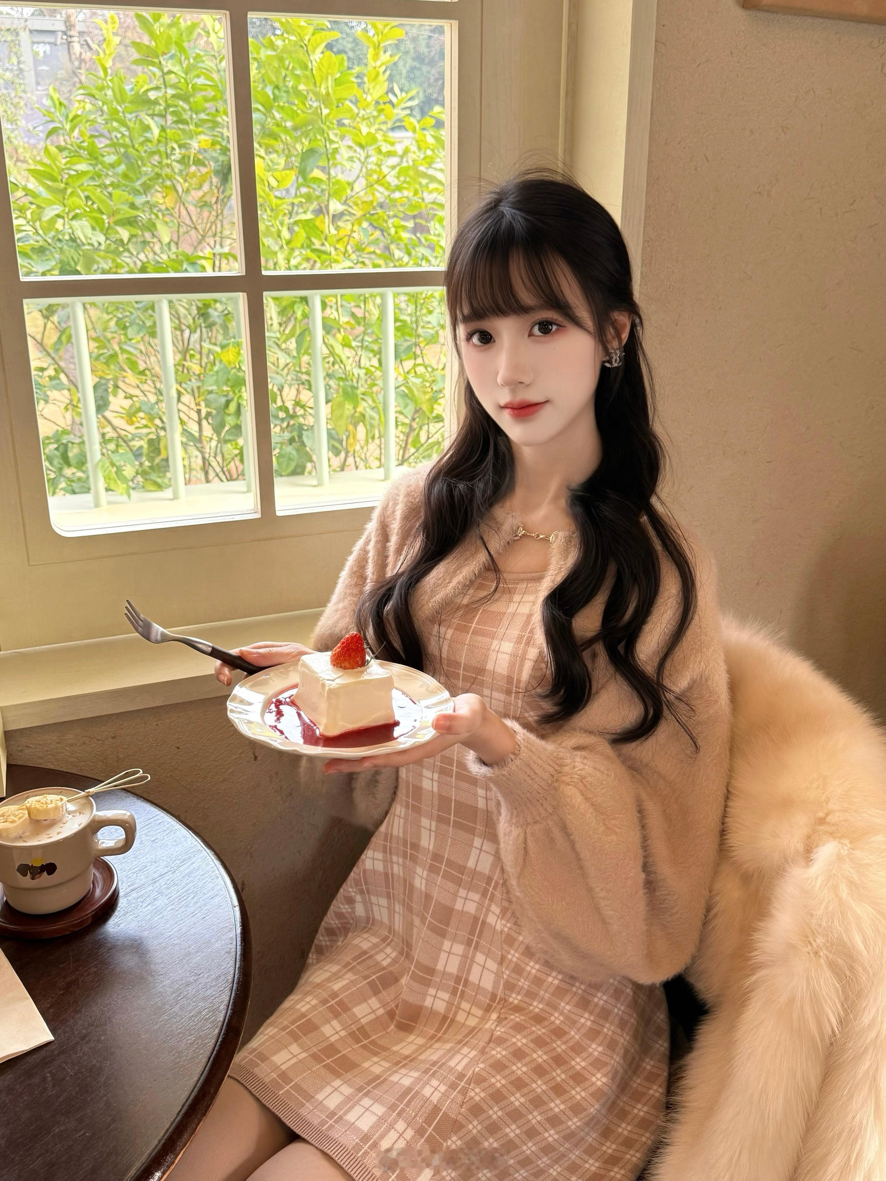 一位东方大美女,真人,肤白貌美,五官精致,精致爱豆妆容,紧身毛绒连衣裙,高跟靴,