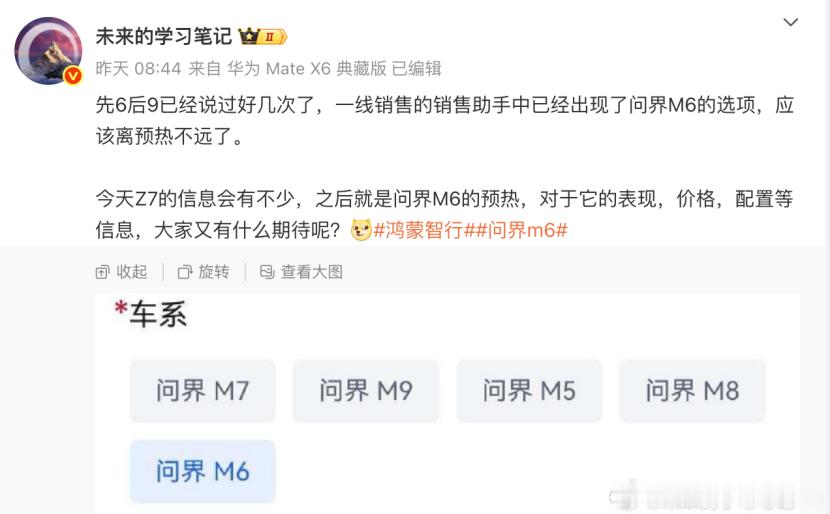 问界M6要来了!一线销售的销售助手中已经出现M6的选项!日前,一位博主透露了问界一线销售的销售助手中已经出现了问界M6的选项,这意味着问界M6即将进入公众视野中了。其实早在去年12月9日的鸿蒙智行年度直播中,余承东就曾透露过要问界M6填上,大家觉得这款问界M6会不会有惊喜?价格会卖多少呢?鸿蒙智行问界M6