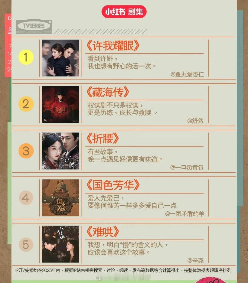 年度热门剧集TOP5:赵露思 陈伟霆《许我耀眼》肖战《藏海传》宋祖儿 刘宇宁《折腰》 杨紫 李现《国色芳华》白敬亭 章若楠《难哄》