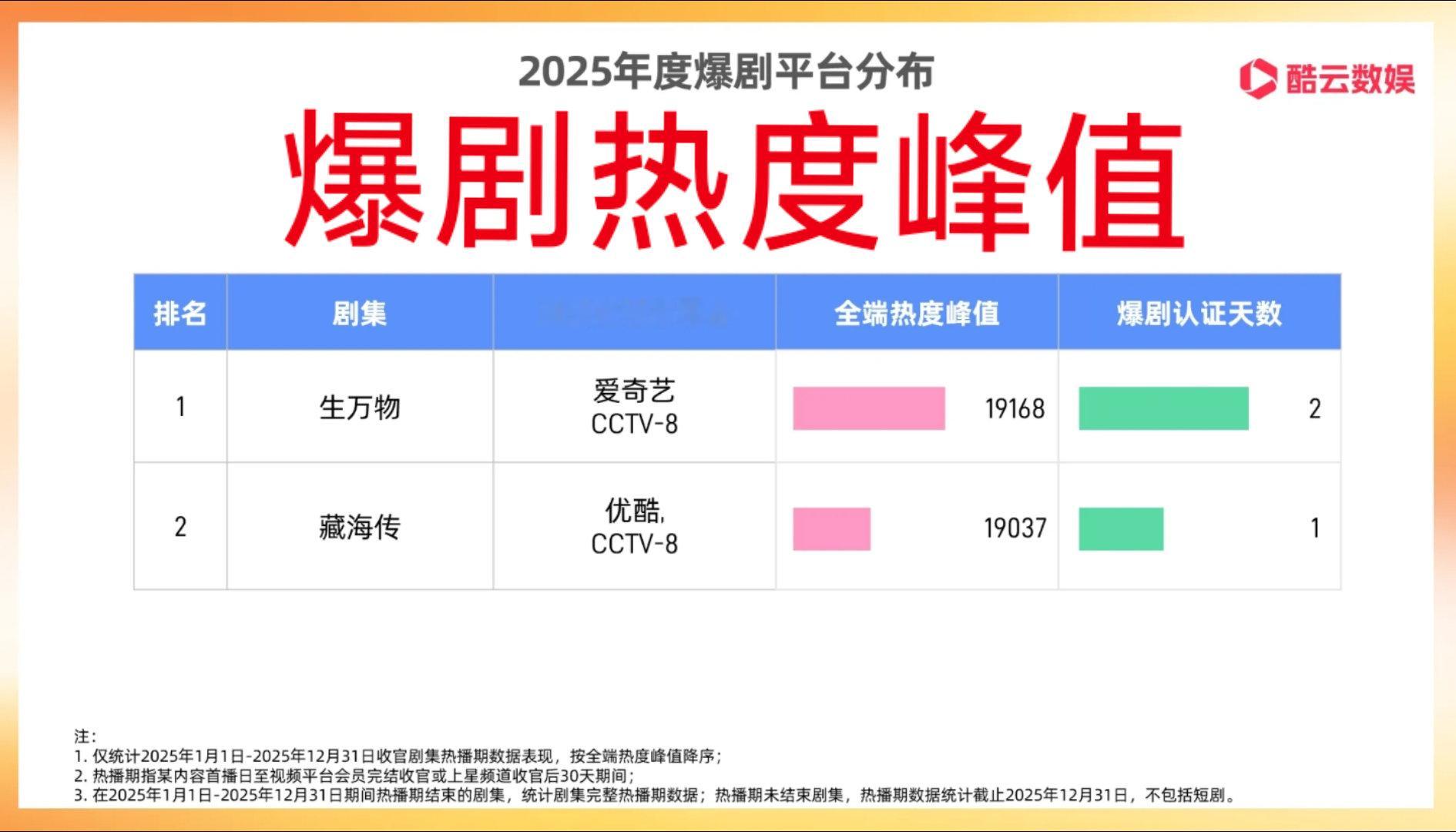 酷云平台年度爆剧热度指数——❶杨幂,欧豪《生万物》,热度峰值19168。❷肖战,张婧仪《藏海传》,热度峰值19037。之前侯鸿亮说《生万物》很牛,也是根据数据客观表述吧。
