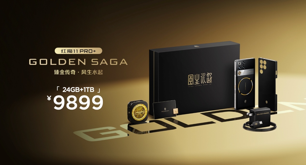 红魔11 Pro+ 臻金传奇:24GB+1TB顶配存储+航天级蓝宝石后盖,散热用上金银复合架构+镀金VC,专属磁吸散热器、臻金卡针全套配齐,9899元!