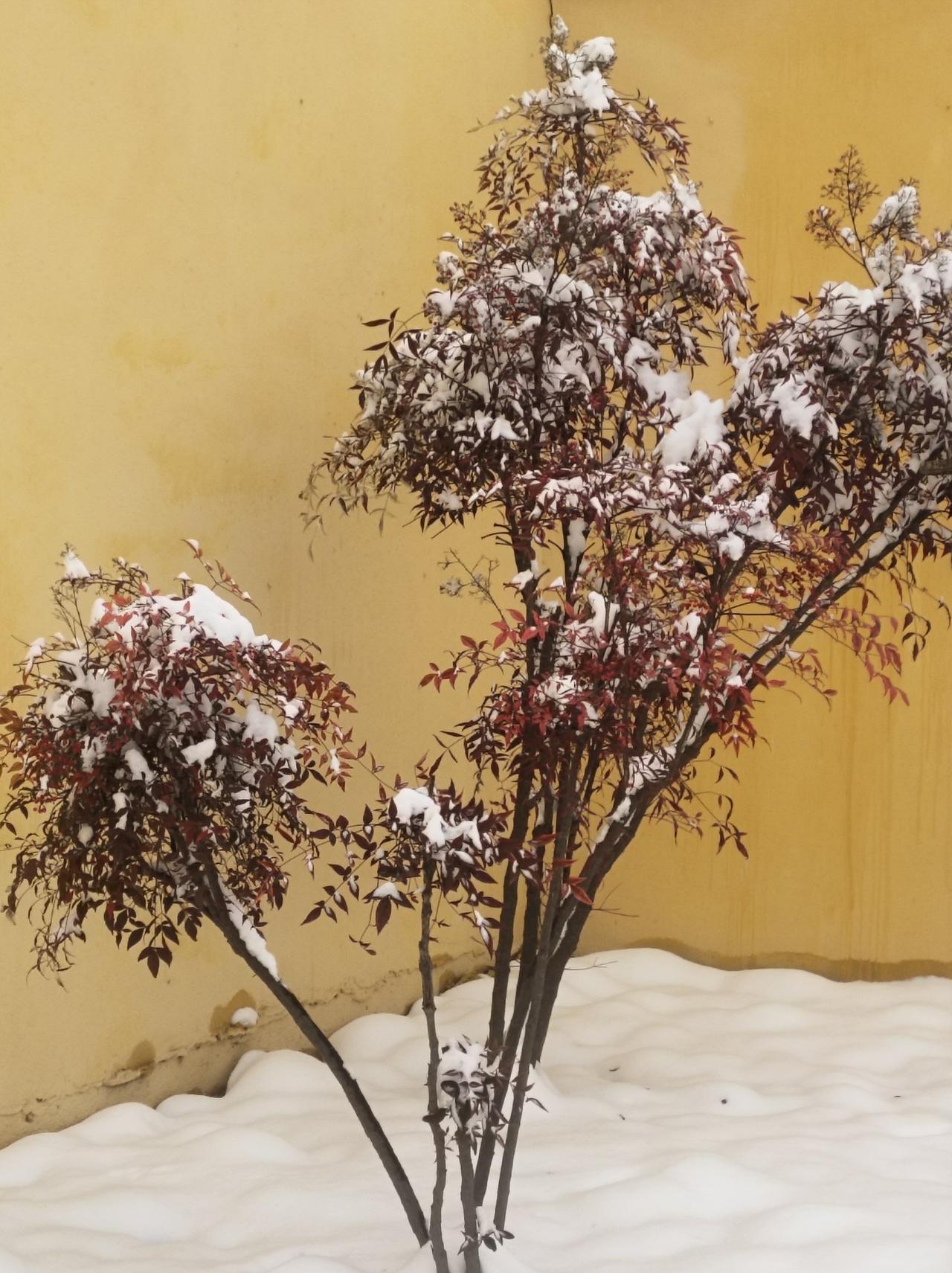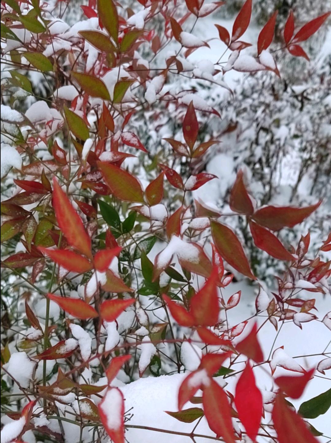 冬日暖阳下,雪中南天竹,不畏寒霜,红叶似火,静谧而美丽。🔥🌿