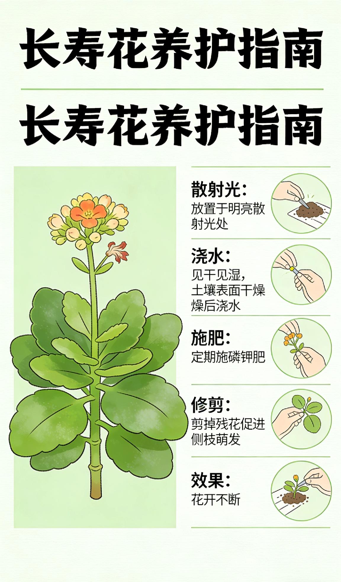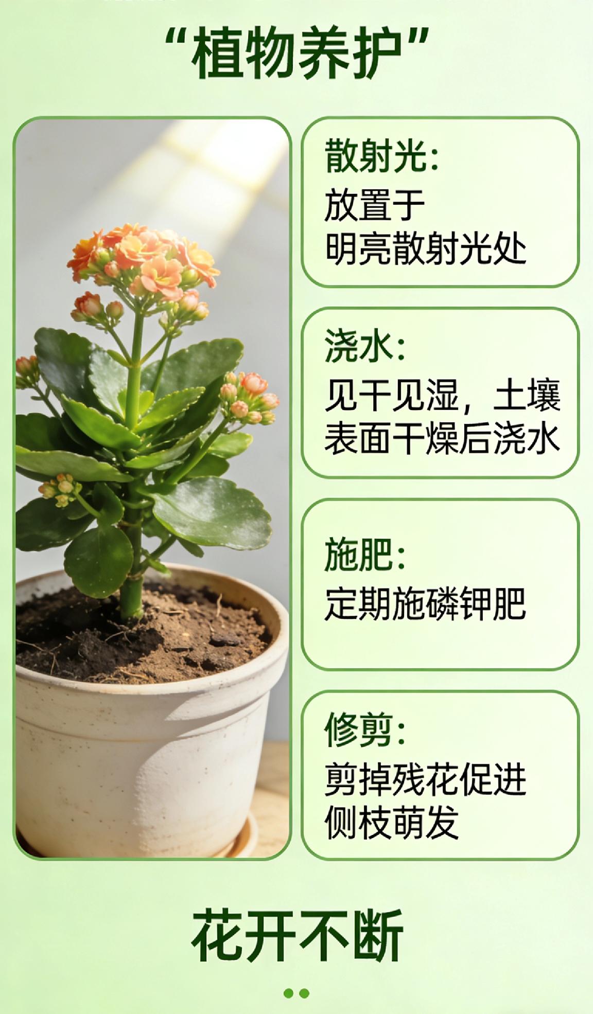 想让长寿花花开不断?记住这几点!每天给它4-6小时散射光,避开正午暴晒;浇水遵循见干见湿,别积水烂根;花期每10天施一次稀薄磷钾肥,薄肥勤施;花败后及时剪掉残花和花杆,促进侧枝萌发。做好这些,长寿花就能一茬接一茬开花啦!长寿花 盆栽长寿花 冬季长寿花 长寿花盆栽