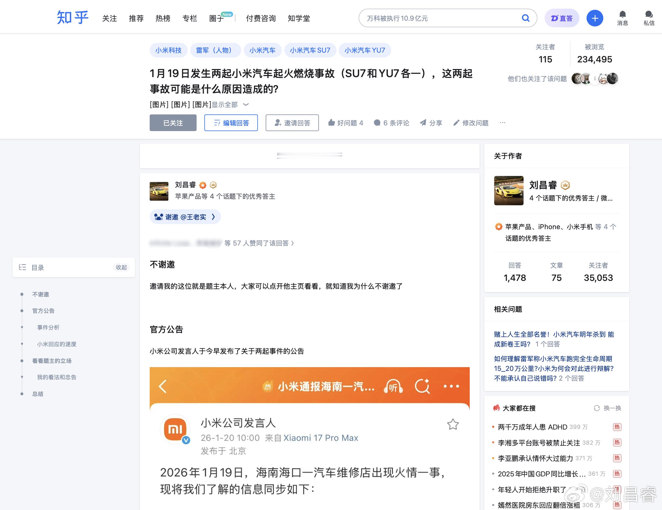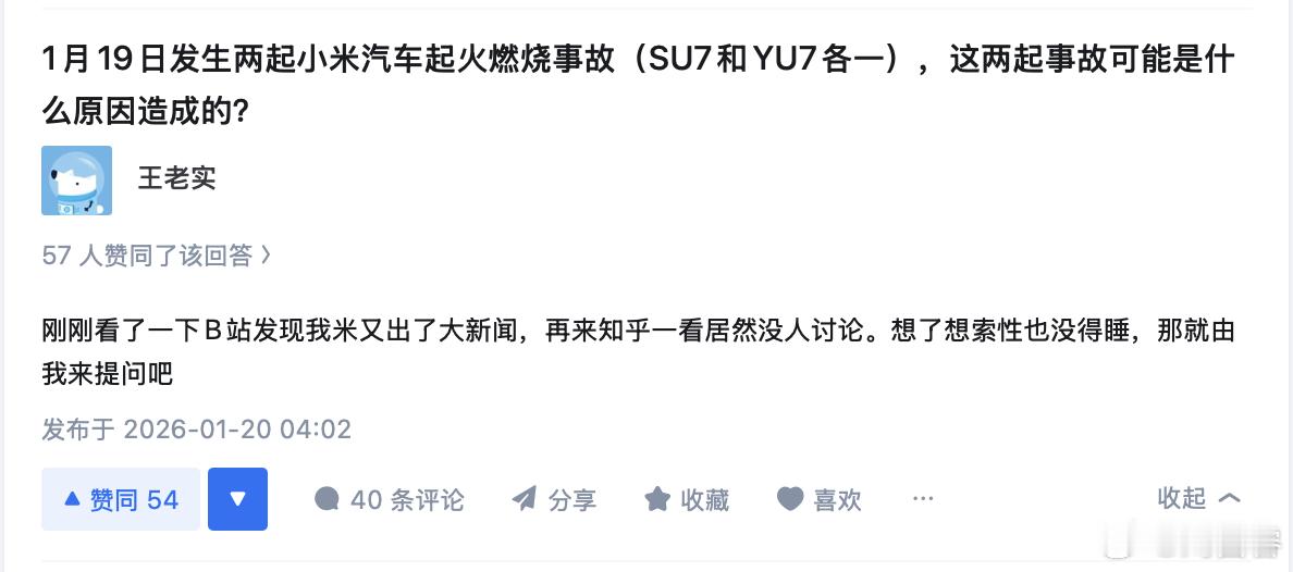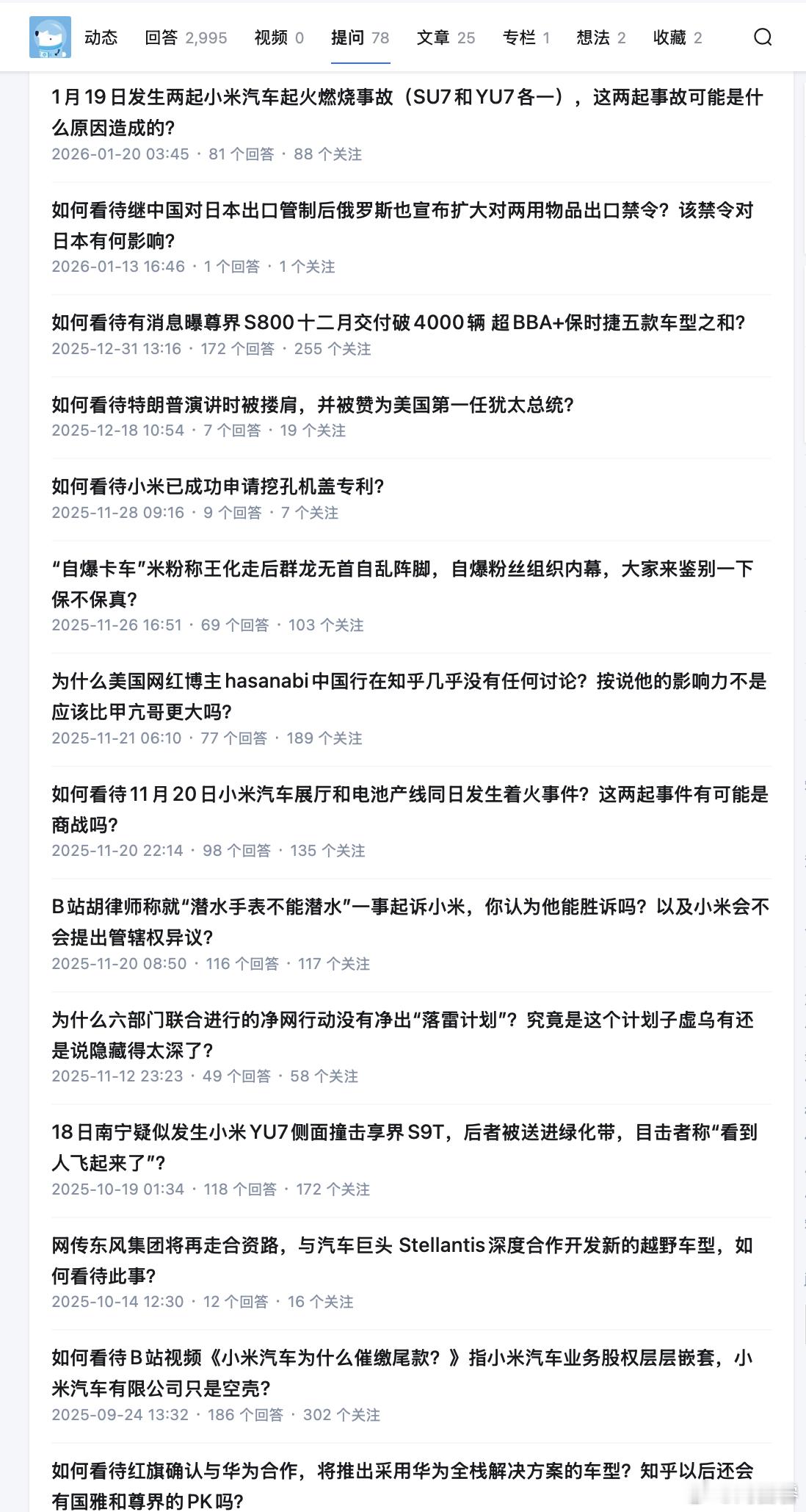 今天,知乎上关于小米事故的提问也有很多讨论提问者跟我上一条发的那位,是很像的 网页链接熟悉我的都知道,我不是一个爱用立场攻击别人的博主,我更在乎事实,但讲完事实,也不妨顺便看看立场 这位提问者提过 78 个问题(图2)我截图的这 14 个里(图3)8 个小米相关话题 且均为负面,2 个华为相关的话题 且均为正面而这题 TA 今天凌晨 3:45 提问、4:02 自问自答(图4)别人大半夜不睡觉,可能是过夜生活,这位大半夜不睡觉,却是在想尽法子推广小米负面、扩大影响讲真,我自称为米粉,但对于很多小米相关的事件(比如昨天事故)反而是从某些米黑嘴里得知的我真心好奇,你们不累吗?如果有钱赚那还好点,至少为了生活、为了家人,赚钱嘛 不磕碜…但如果只是「为爱发电」,为了你们的精神领袖,这样耗费自己的时间和精力,值得吗?一个正常人,如果不喜欢某品牌、某高管,应该是不关注、不主动了解、避而远之,绝不会主动花时间去和本就不喜欢的品牌用户接触 并和他们高强度对线然而事实往往恰恰相反……如果这真是没有组织、没有黑幕的自发性行为,那反而更加可怕……小米通报海南一汽车维修店火情小米汽车在海南河南先后出现火情 佛山