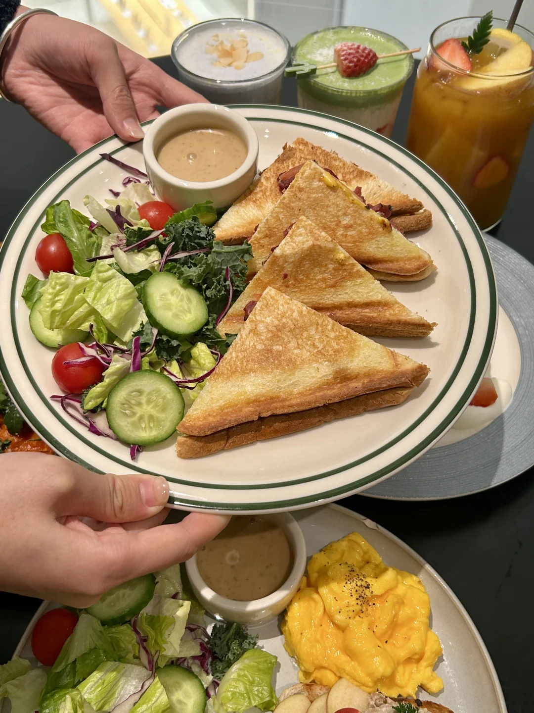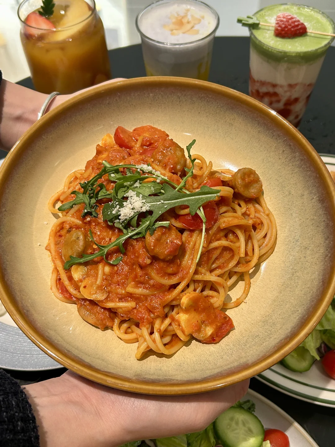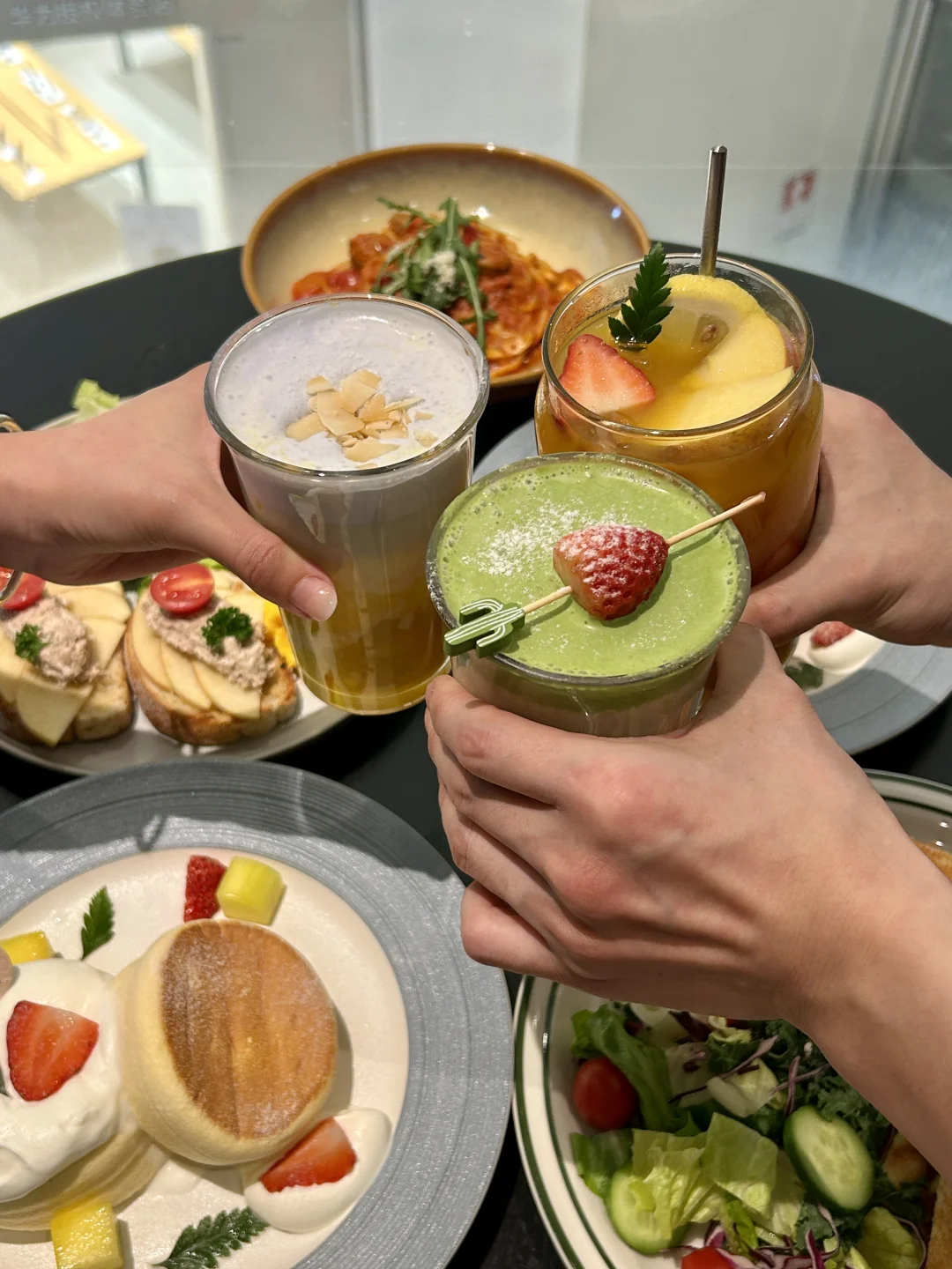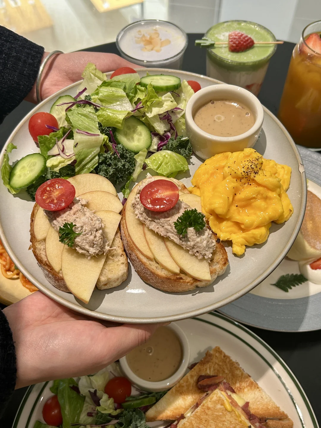 ⭐️番茄🍅奶油意粉:意粉🍝裹满了新鲜番茄浓汁,酸酸甜甜很开胃🤤 ⭐️抹茶草莓🍓牛乳:确认过眼神👀就是我喜欢的味道🥹~抹茶奶盖浓郁,一直喝到后面又是甜甜的草莓🍓果酱😋 ⭐️舒芙蕾松饼🧇:入口特别松软,好像吃进了一口云朵☁️还有奶油、草莓和芒果块点缀,就看着它duangduang的舍不得吃了🤩 ⭐️低脂吞拿鱼全餐:外焦内软的面包片打底,中间是tree tree的苹果🍎片,表面是新鲜吞拿鱼肉,入口很有层次感,尊嘟一口惊艳🥰