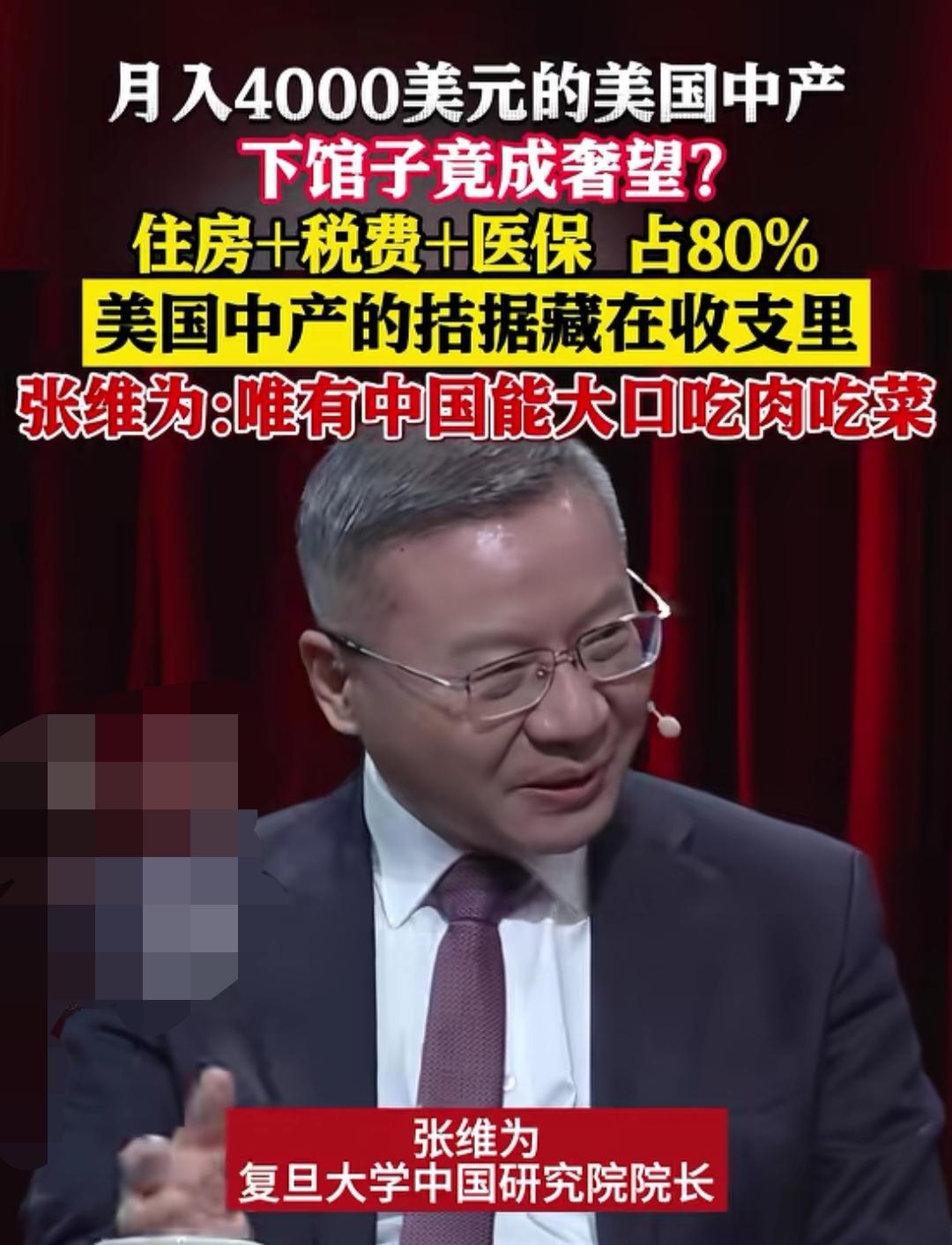 张维为:月入4000美元的美国中产,下馆子都是奢望,跟我们没法比! 张维为教授曾经在《这就是中国》节目,尤其是“洋悟”运动:中美民众大对战一期(第273期) 。他提到美国中产月入4000美元,住房、税费、医保占收入80%,食品预算仅约10%,下馆子成奢望;同时强调中国食品供给充足、价格亲民,普通人都能大口吃肉吃菜,民生优势我们更加明显!因为我们普通人都能天天大口吃肉喝酒,对美国民众来说是一种奢望。 4000美元的月收入,在美国看着不算低,可三大开支直接占了80%,根本省不下来。首先是税费,联邦税、州税、社保医保税一扣,就得少拿1100到1200美元,这是硬性支出躲不开;其次是住房,想住个治安好点的社区,一室户的月租就得1500到1700美元,占了快一半收入;最坑的还是医保,普通个人高免赔额的医保计划,每月保费就要500到600美元,这三项加起来,3100到3500美元就没了。 剩下的500到900美元,得扛下车贷、水电网、日用品,还有一家人的吃饭钱,真正能花在食品上的预算也就400美元左右。这点钱也就够天天居家做饭,想买点新鲜肉菜都得精打细算,更别说下馆子了。美国快餐随便吃点就要10到15美元,正经正餐人均20美元起步,算下来一个月顶多能吃1到2次,还是得挑便宜的店,下馆子真成了稀罕事。 反观咱们中国,就算是一线城市的普通收入人群,硬性开支占比远没这么高。房贷或房租占收入的三成左右就差不多,医保一个月也就几百块,还能报销大部分医药费,压根不用花大价钱买商业医保。最关键的是食品这块,咱们进口的大豆、小麦性价比高,本土农产品供应也足,菜市场、超市里肉蛋菜价格都亲民,几十块钱就能买上一大袋,日常大口吃肉吃菜完全不用心疼钱。普通人打工一个月五六千,一年也有五六万,这样的收入已经属于高水平了,因为大家买得起车,买得了房,大家每天大鱼大肉,有的还带家人去游山玩水。吃好喝好玩好。美国人虽然一个月几万块钱,但是很多人都没房子住,只能睡桥洞,也不敢大口吃肉,只能啃馒头。对我们的生活水平羡慕的不得了。 我们就不一样,想下馆子的话,街边小吃、家常菜馆选择多的是,人均二三十块就能吃得很舒服,周末全家出去改善伙食,百八十块也能搞定,这在咱们这儿就是稀松平常的事。张维为教授说的其实就是这个理,咱们的民生保障让基础生活成本更可控,普通人的消费幸福感,其实远不是那些看似收入高的美国中产能比的。说到底,日子过得好不好,不是看账面收入多少,而是看扣完开支后,真真切切能享受到的生活质量。 有的美国人月收入4万块人民币,一年才40多万,打工10年才有400多万。在美国只能算是穷人。但是来中国的话,400万可以够花一辈子了。在中国月收入四千,年收入四万多,要打工70年才有400万。所以很多人去外国打工,然后拿到国内花。以我们普通人目前的收入,到美国只能算是穷人。但是在国内已经属于上流社会成功人士了。因为我们的物价便宜,大家想买什么就买什么,不用担忧买不起,只是不想买而已。