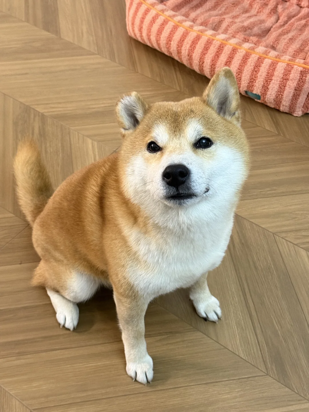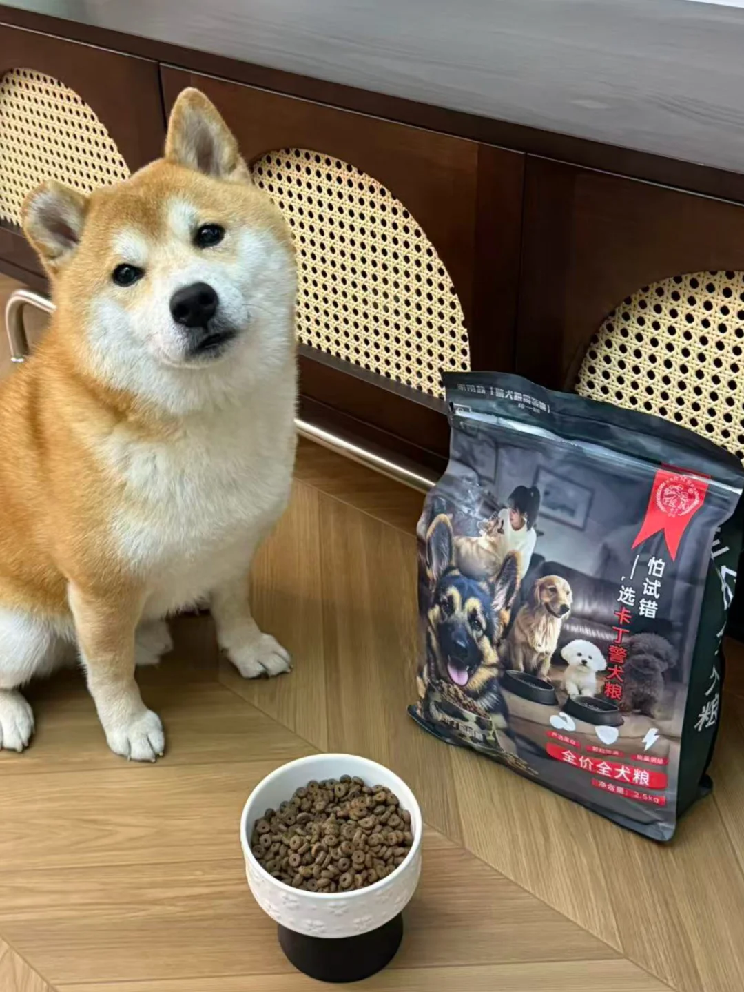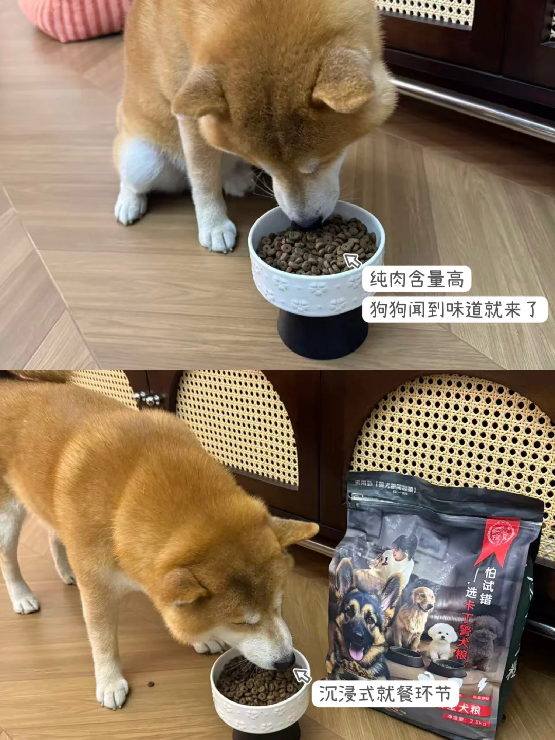 低头闻闻狗碗,抬头盯妈)