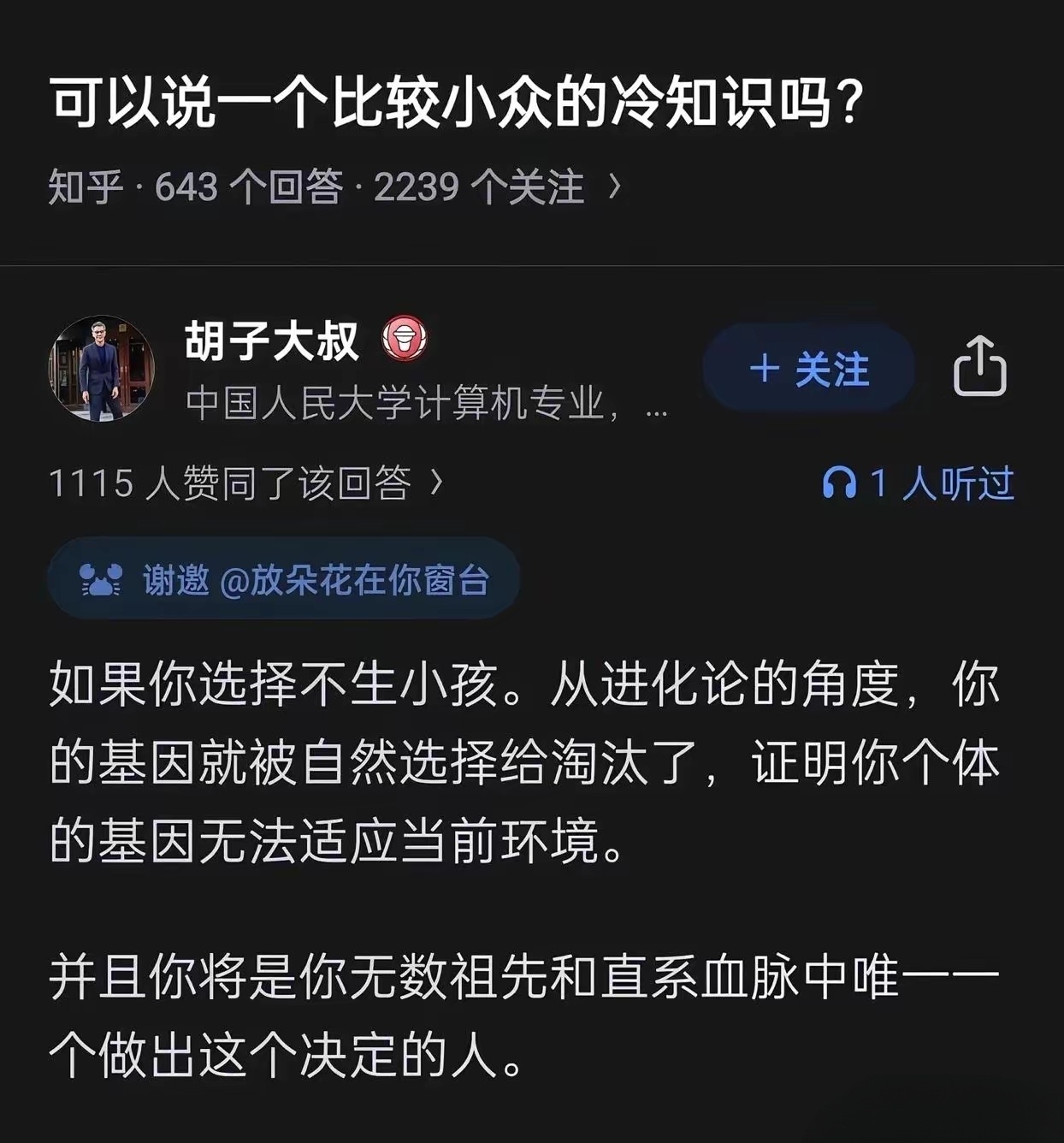 不存在什么你的基因,最多有几个突变的基因,哪怕你有后代也不一定遗传。你也只是直系的先辈有后代而已,亿万分支的没有的多了去了。