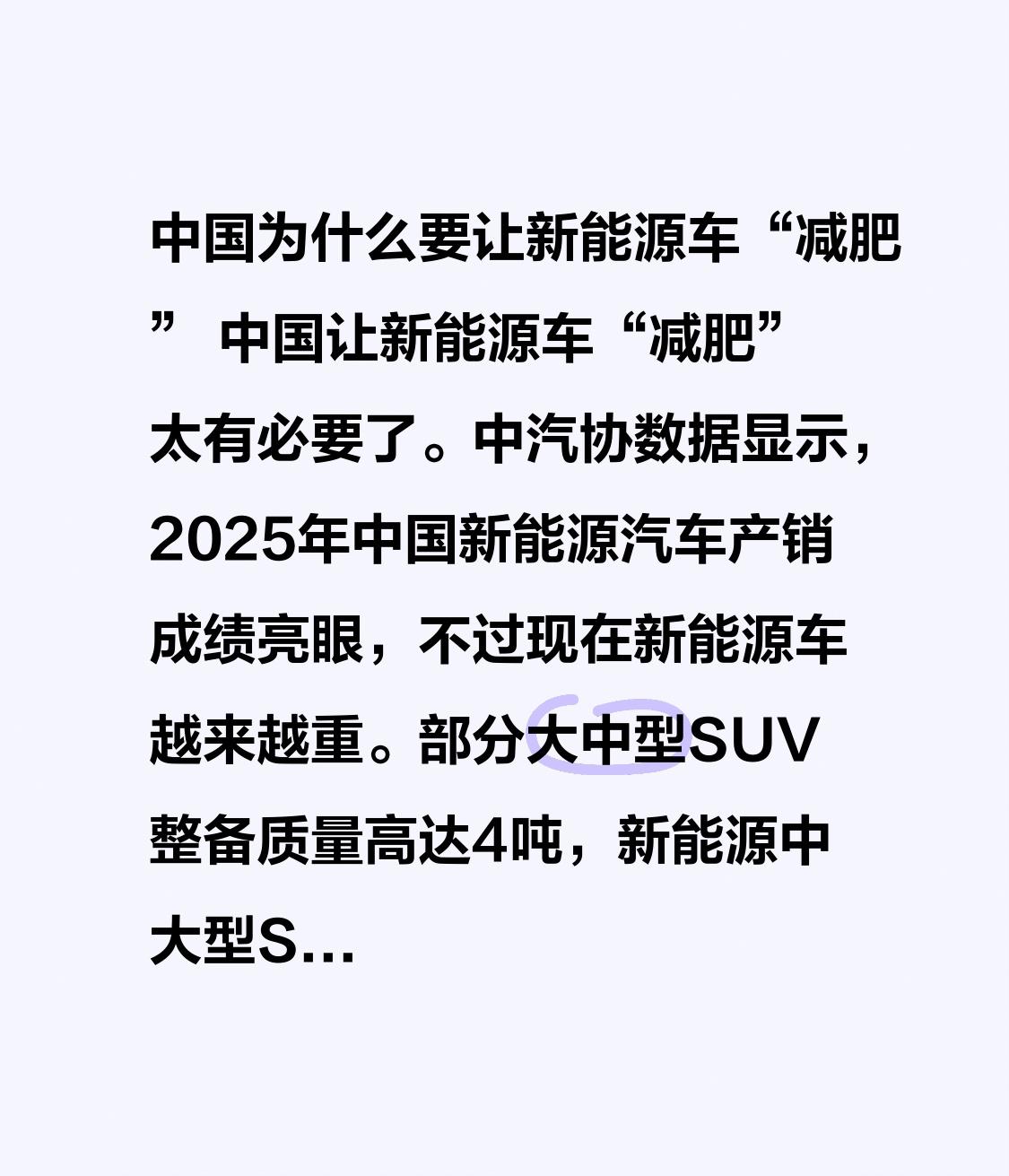 中国为什么要让新能源车“减肥” 中国让新能源车“减肥”太有必要了。中汽协数据显示,2025年中国新能源汽车产销成绩亮眼,不过现在新能源车越来越重。部分大中型SUV整备质量高达4吨,新能源中大型SUV普遍超2吨。和燃油车相比,新能源车平均整备质量要重20%-30%,像宝马X3电动版就比燃油版重25%,核心原因就是电池。 车重激增能耗也会攀升,还影响操控稳定性、延长制动距离。今年实施的国家能耗强制性标准,就是在倒逼新能源车“减肥”,这既是挑战也是机遇,能推动行业发展观转型。