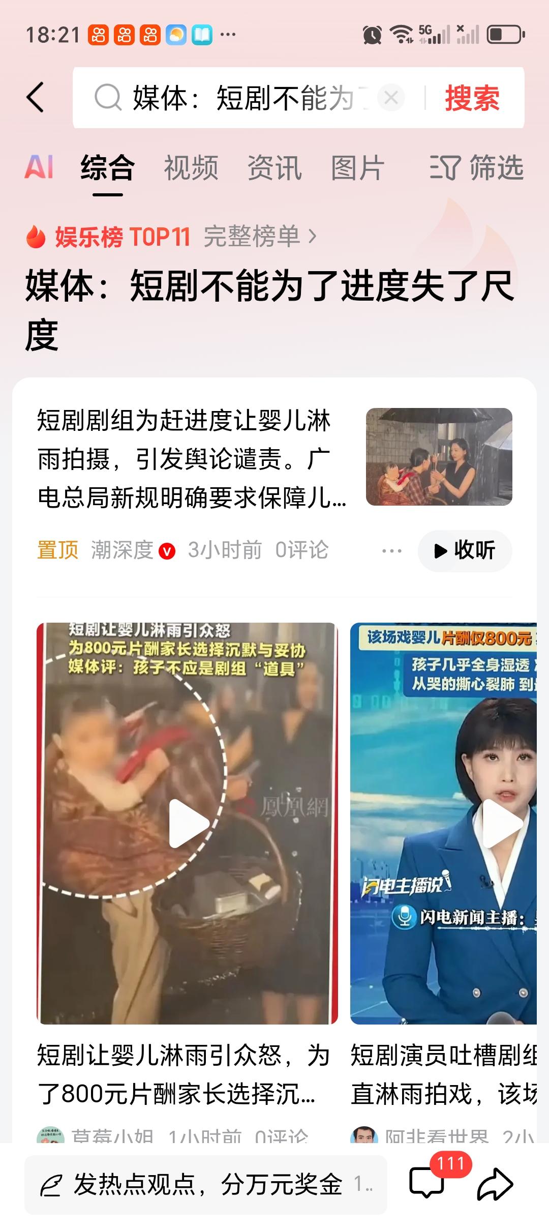 媒体:短剧不能为了进度失了尺度 短剧行业“短平快”模式快速崛起,可这“快”却快出了问题。有短剧演员爆料,某剧组夜里拍雨戏,为节约时间,让婴儿一直淋着洒水车制造的大雨,孩子哭得撕心裂肺,家长仅拿到800块片酬。 现在短剧拍摄周期极短,7到10天就要完成一部剧,剧本、拍摄、后期都像赶任务。为了赶进度,剧组抱着“小孩子好哄”的心态,让孩子熬夜拍戏、淋雨曝晒。可孩子免疫系统未发育完全,这样的折腾他们哪能承受?国家广电总局已发布相关管理提示,短剧不能只追求进度而失了尺度和温度,剧组必须重视起来,保护好孩子的身心健康。