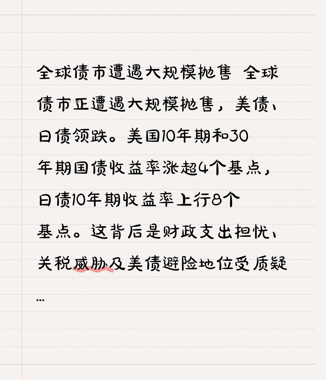 全球债市遭遇大规模抛售 全球债市正遭遇大规模抛售,美债、日债领跌。美国10年期和30年期国债收益率涨超4个基点,日债10年期收益率上行8个基点。这背后是财政支出担忧、关税威胁及美债避险地位受质疑等因素作祟。 特朗普为收购格陵兰岛计划对部分欧洲国家征关税,加剧通胀和财政赤字忧虑。抛售潮波及全球,日本30年期、40年期国债收益率大幅上升,澳大利亚、新西兰、德国债券也受影响。 值得注意的是,中国近年来持续减持美债,虽美国财政部数据显示外资持有美债总额增加,但外资持有占比却在下滑。全球债市根基正被动摇,后续发展充满不确定性。