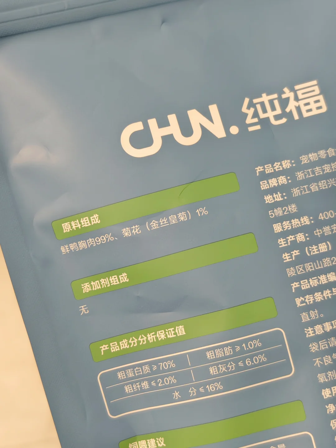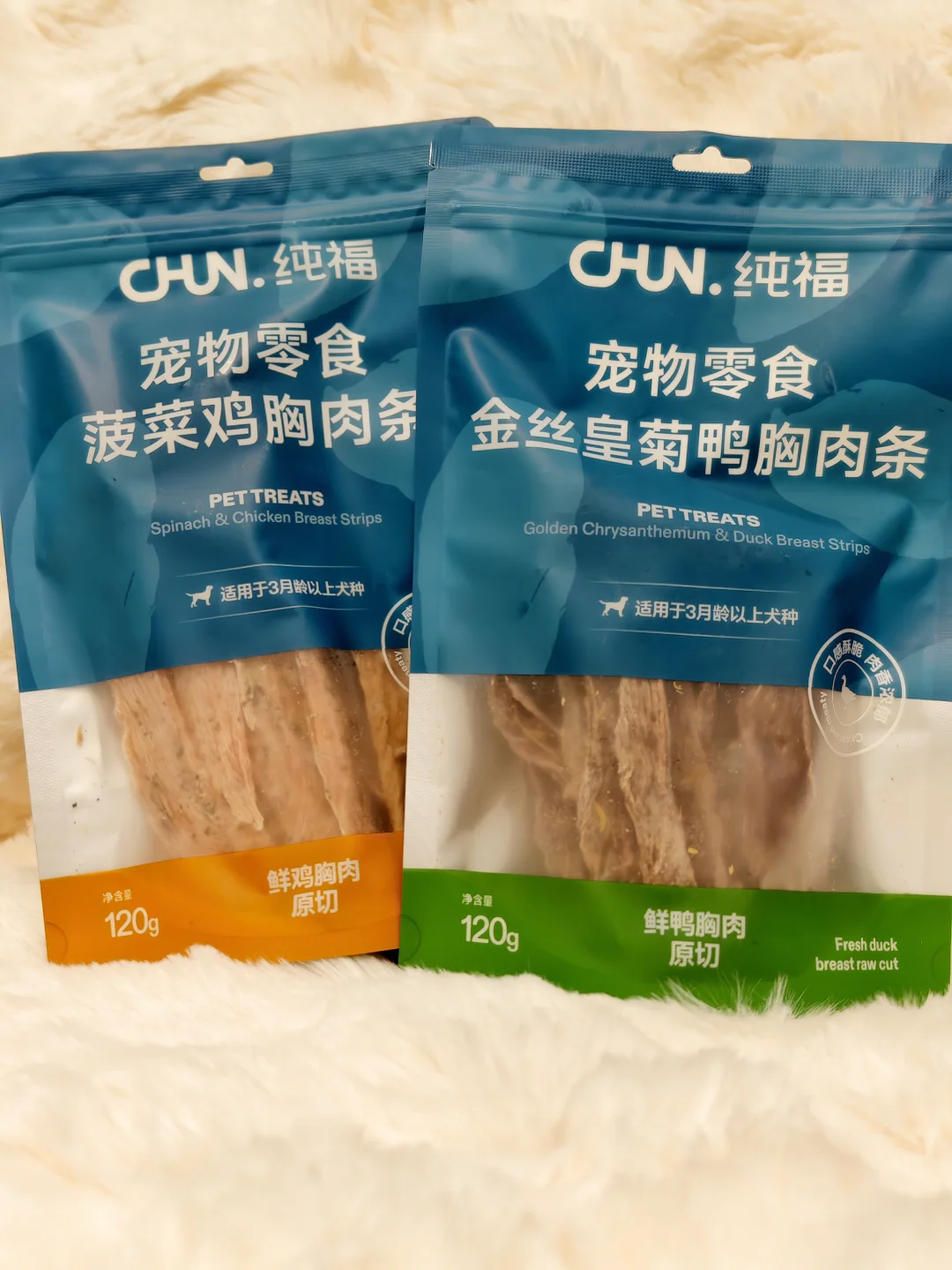 鸡肉鸭肉两款肉干我都入手了,看了一下配料都很干净,鲜肉➕菠菜和菊花,都很有针对性。鸡胸肉条是加菠菜碎的,可以帮助清新口气;鸭胸肉条是加了金丝皇菊,再加上鸭肉本身性凉,清热下火对泪痕比较友好。