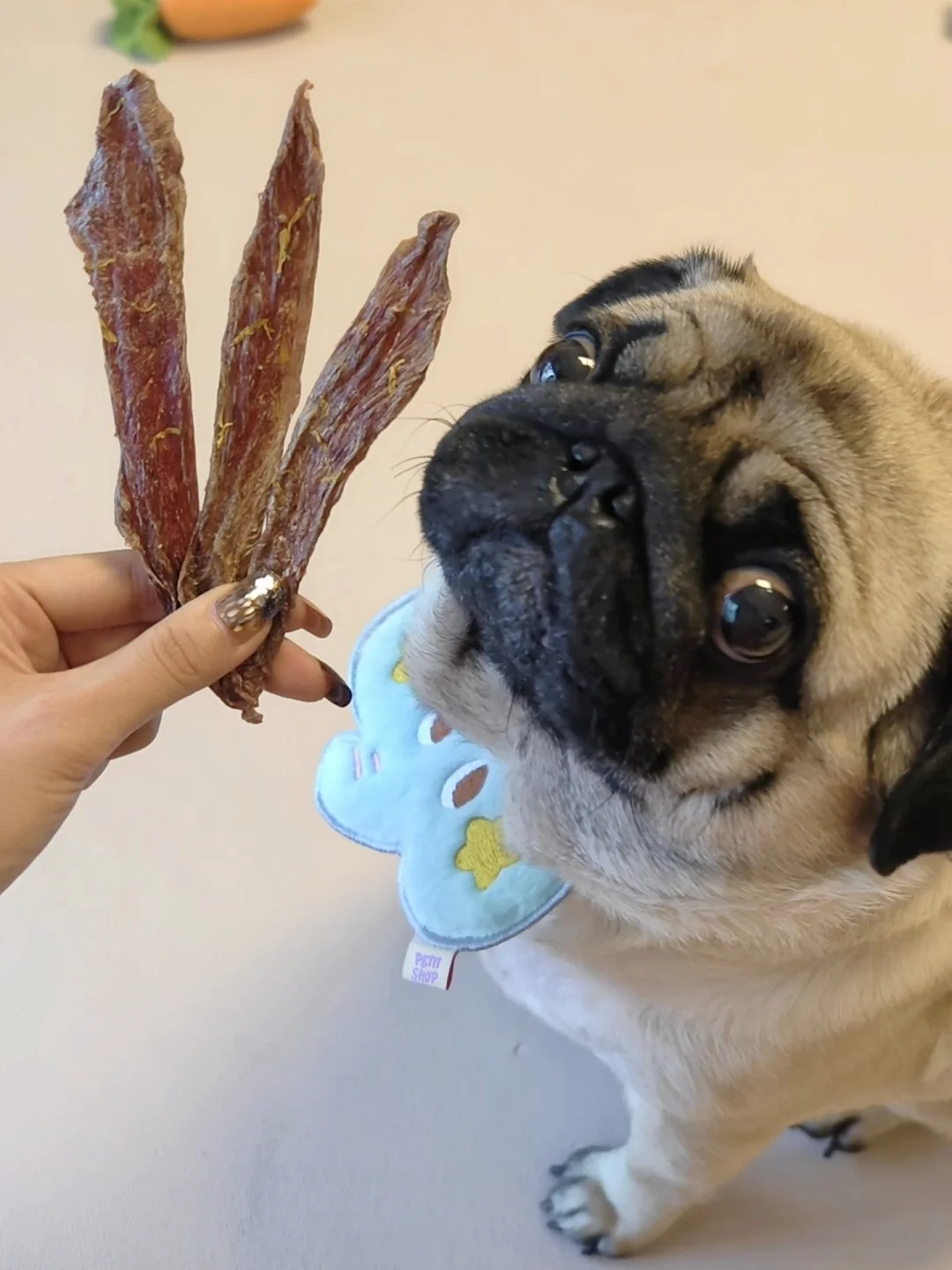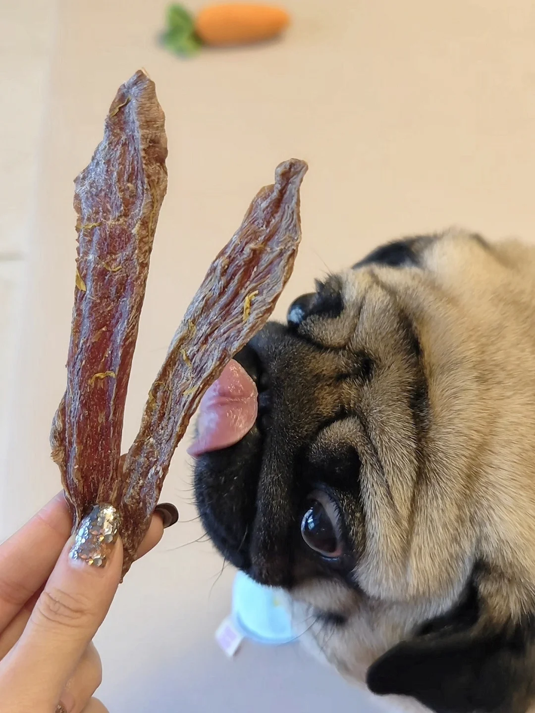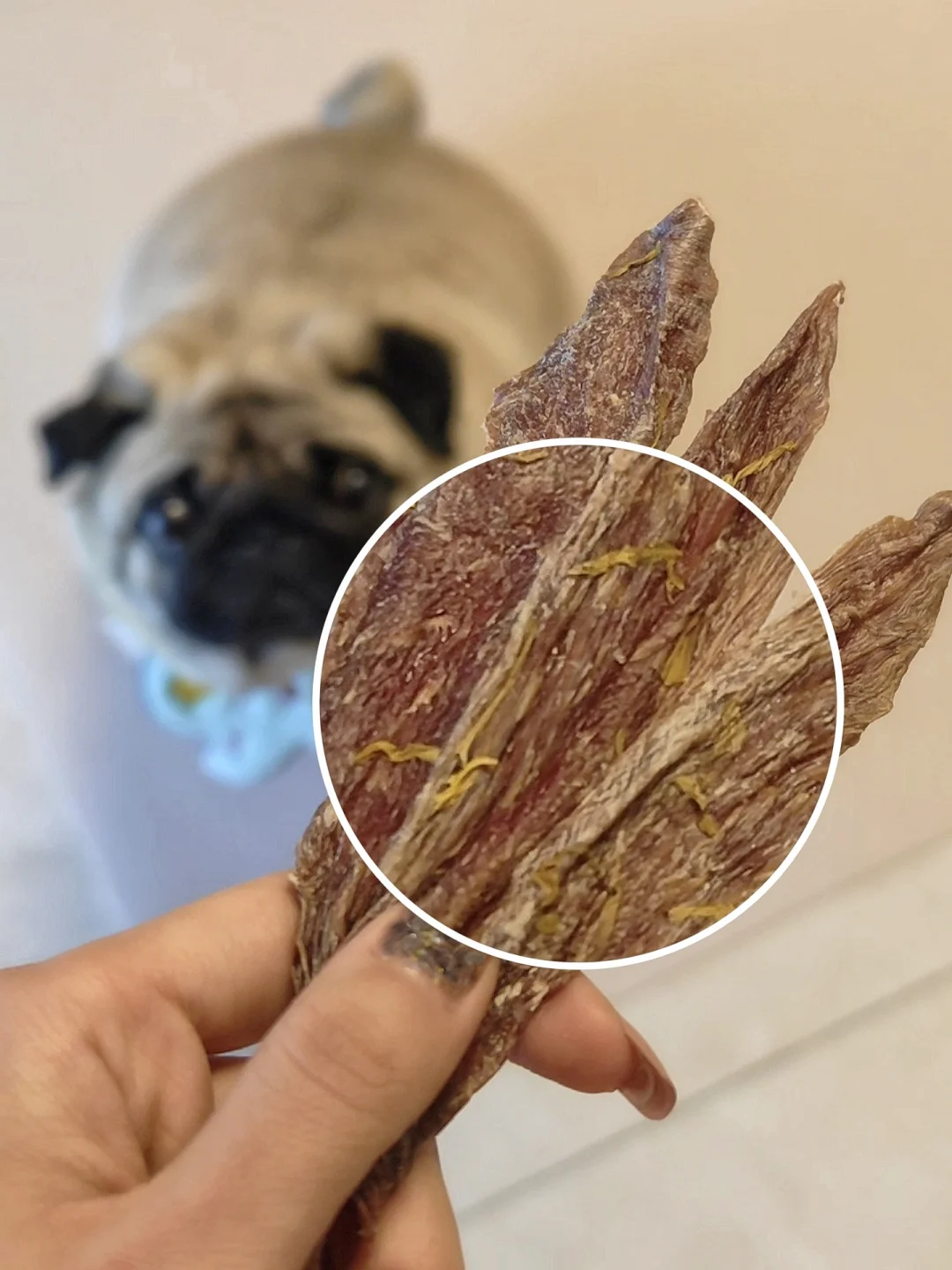 拆开袋子最明显的感觉就是很香,没有别的劣质肉干零食那种腥味,就是很纯正的肉味,分量也挺足的。拿出来就开始疯狂分泌口水了哈哈哈哈,一下子就给炫了两根,嚼起来还是很酥脆的,磨牙吃吃也很合适。