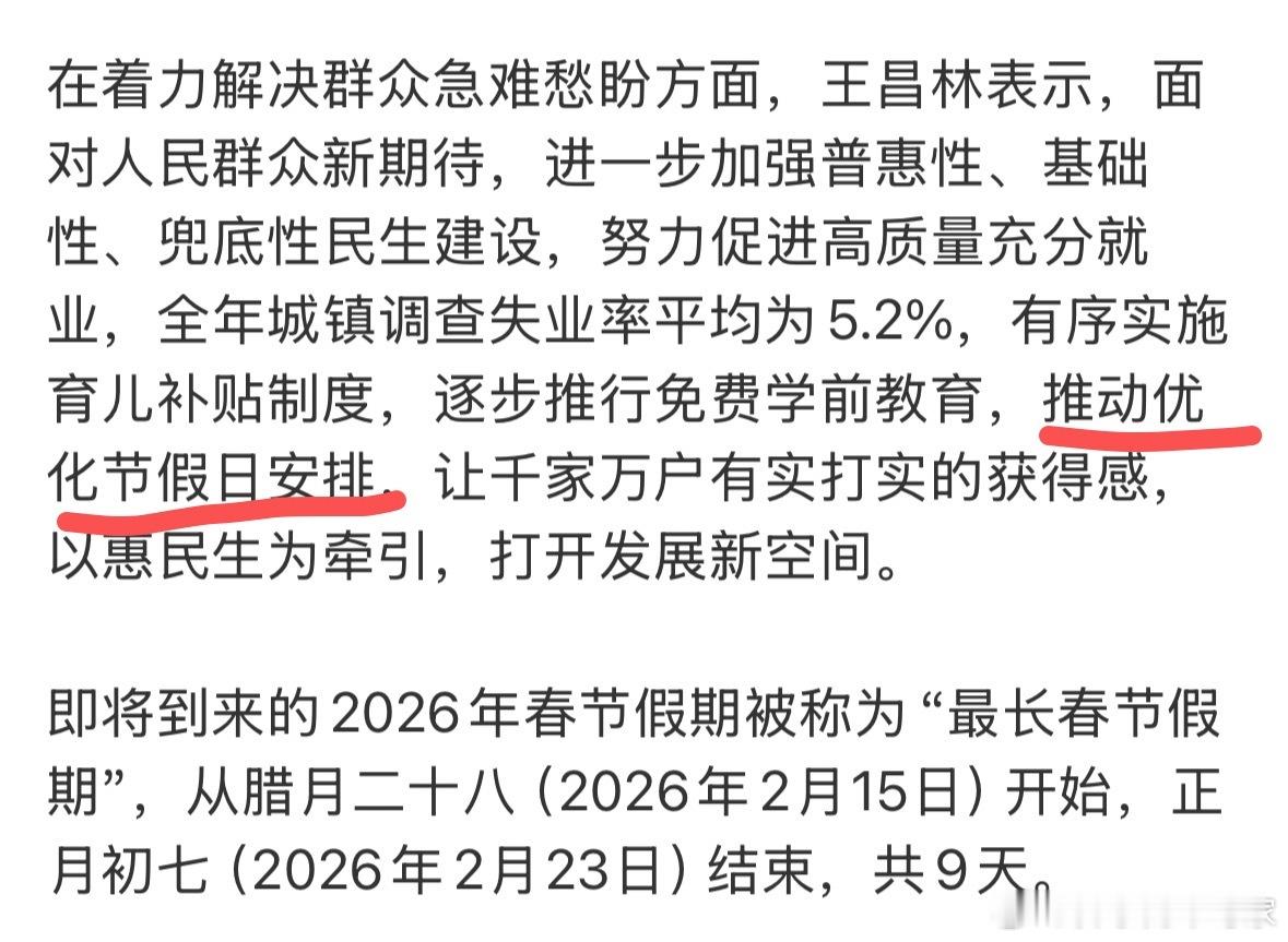 真的在听取意见,减少调休!!12月份发改委主任:我委认真分析研判,2026年春节放假9天并减少调休,回应了社会期待,这个月又提一次优化节假日,期待一下调休永远退出休假制度,虽然过程是慢的,但是相信一定会的,一个又好又坏的消息是,情人节调休,这下可以省钱了