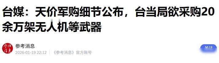 台湾买武器,赖清德推责任,老百姓买单 2026年1月19号,台防务部门公布一个大项目,准备花1.25万亿新台币采购武器,包括20多万架无人机、上千艘无人艇,以及海马斯火箭炮和标枪导弹,官方声称这些装备是为了让大陆不敢动手,但资料显示这不像防御措施,反而像把台湾当作炮灰堆。 美军提出的战术方案,本质上就是把台湾当作诱饵,用大量便宜的无人机和无人艇去消耗解放军的弹药,等到两边打得差不多,美国人再出来调解,这种情节像电影里演的,现实中他们确实这么做,台湾自己花钱买装备,战场也设在岛上,最后受苦的是当地老百姓,这根本算不上自卫,而是把自己变成战争的缓冲地带,谁都能来踩一脚。 这笔钱花得太过头,1.25万亿新台币,差不多是台湾全年教育经费的两倍半,学校、医院和养老院的钱都得被挪走,现在台湾财政赤字已经占到GDP的6.2%,再这样花钱下去,债务会把整个经济压垮,普通人的生活成本只会越来越高,看病要排更长的队,养老金变少,孩子上学资源更紧张,这些事情没人公开说,但每个人都要承担后果。 赖清德现在推动这个计划,并不是因为他真的想打仗,而是因为政治压力太大,蓝营和白营都在逼他下台,他就搞出个大新闻来转移大家的视线。