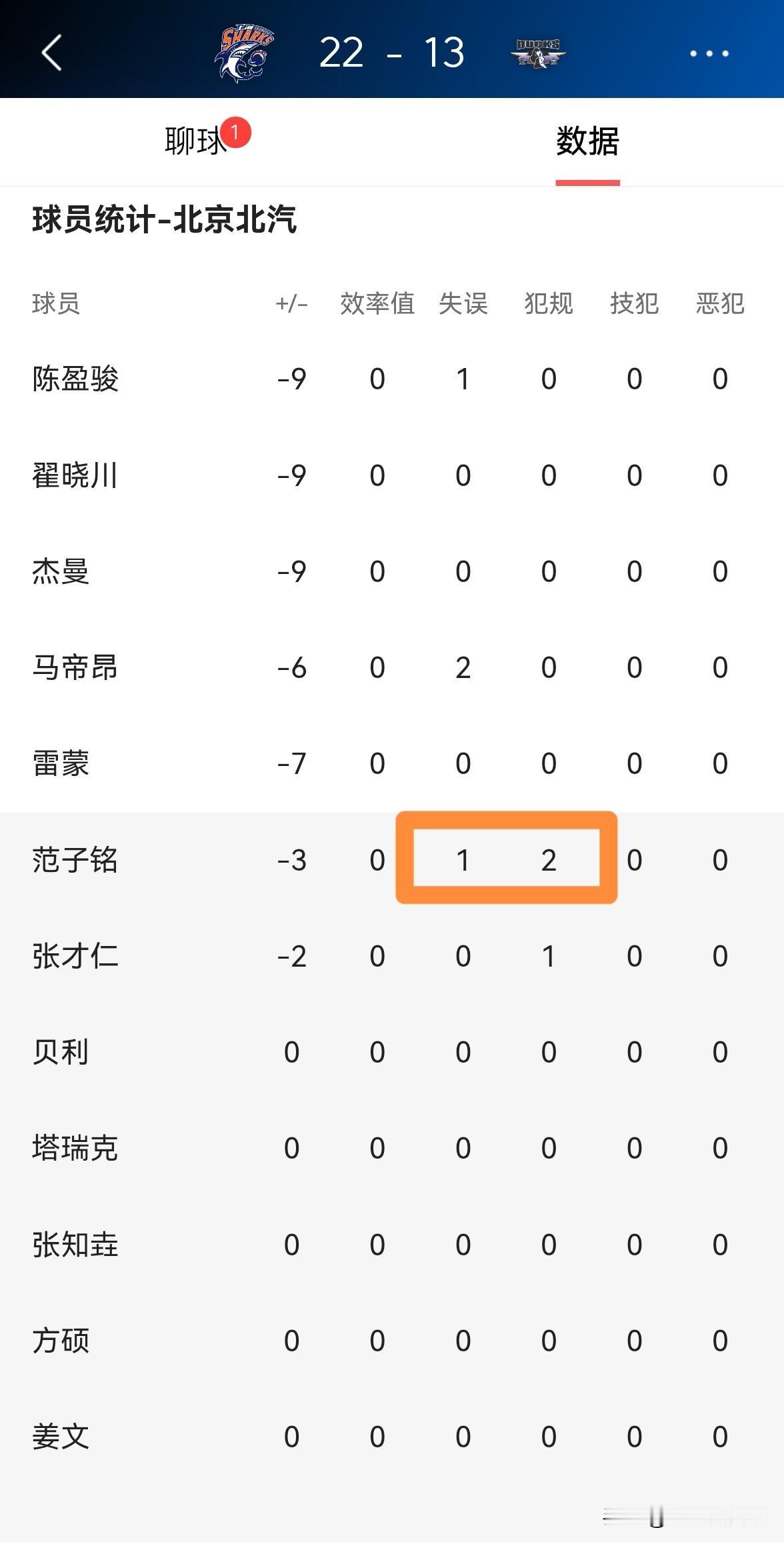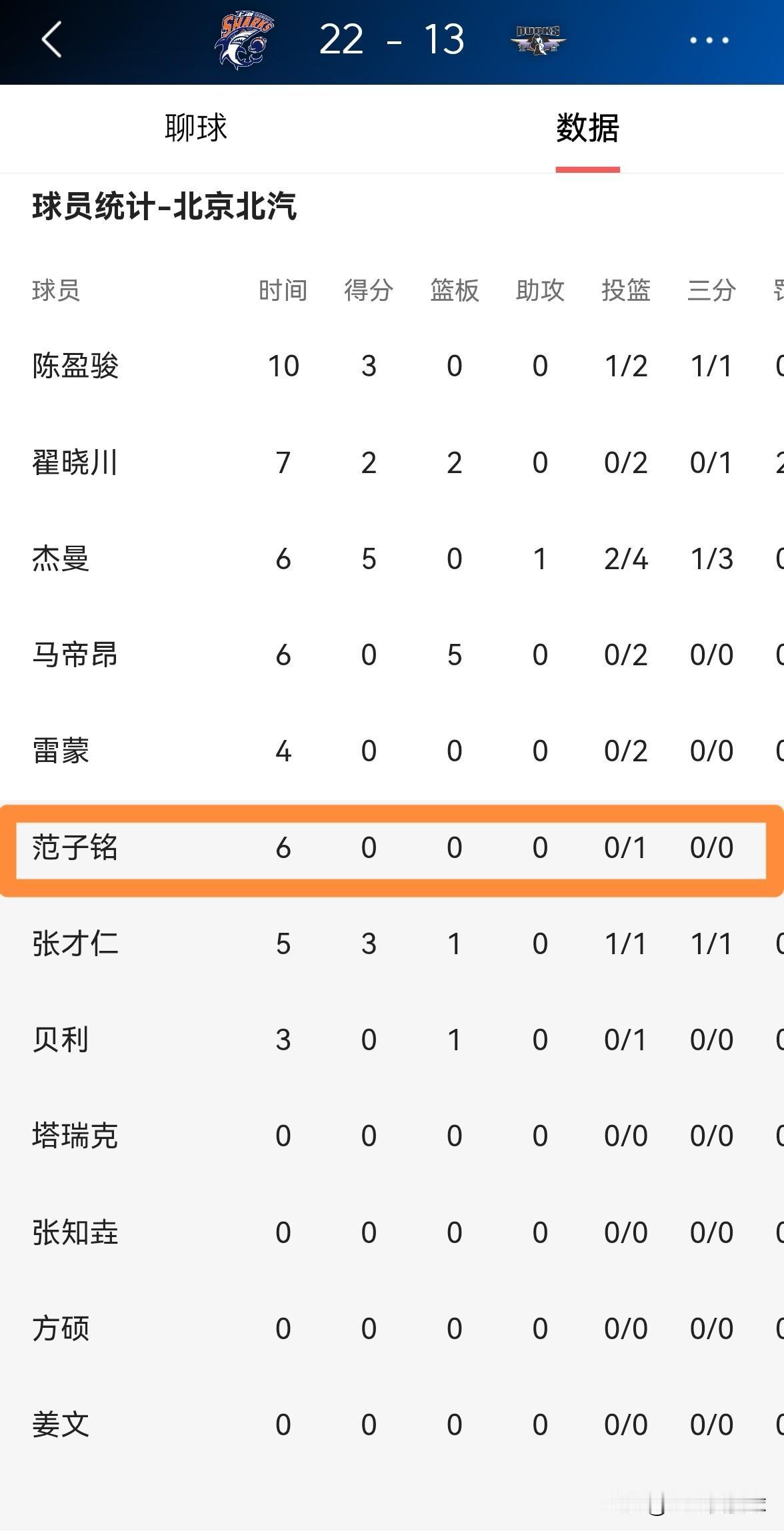 北京北汽大将范子铭真是太可怜了,他惨遭主帅许利民的怒视!在今天北京北汽客场挑战上海久事的比赛中,目前双方的第一节比赛已经结束,北京北汽以13:22落后于对手。在第一节比赛中,范子铭替补出战6分钟,投篮1中0怒砍0分,却有1次失误和2次犯规,他的场上正负值为-3。 值得一提的是,当范子铭在第一节比赛的最后时刻被替换下场休息时,许利民教练直接来到了范子铭的身旁怒视爱将。