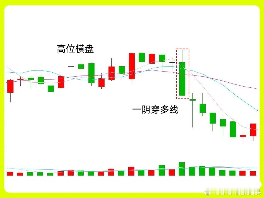 兄弟姐妹们注意了!一旦出现这几种形态走势,我会立马警惕起来,这些往往代表是主力出货,主力的操作手法,虽然隐秘,盘面上,是可以找到蛛丝马迹。老股民都认为,会买的是徒弟,会卖的才是师傅,所以这期内容一定要认真看完第一种,单针探顶形态,股价经过长期上涨以后,在高位,股价出现带有上影线比较长的K线,说明上方抛压比较大,承接力量比较弱,这是典型的多转空形态。上影线越长,抛压就越大。第二种,高开低走大阴线,股价在高位,上涨趋势的末期,一般情况下,前一根是中大阳线,次日出现高开低走,形成大阴线,同时还会出现放量,说明这一天,多空分歧比较大,而且空方更强。第三种:一阴包多阳,这典型的空方力量比较强。股价在上涨趋势里,形成多个小阳线,随后出现放量的中大阴线,一口气把前面的多个阳线,一次性跌破,那就形成一阴包多阳,这也是主力强势出货的表现之一第四种:一阴穿多线,也叫断头铡刀。我们知道,均线的重要,代表平均持仓成本,也是重要支撑和压力。股价在高位出现,中大阴线,一次跌破我们常用多条均线,比如五日均线、十日均线、二十日均线。说明空方力量比较强,均线没有多少有力的反抗一旦出现这四种形态,我会毫不犹豫的关注起来。当然了像股价跌破高位横盘平台,还比如股价跌破上涨趋势线的下沿,都是值得我们关注的位置。