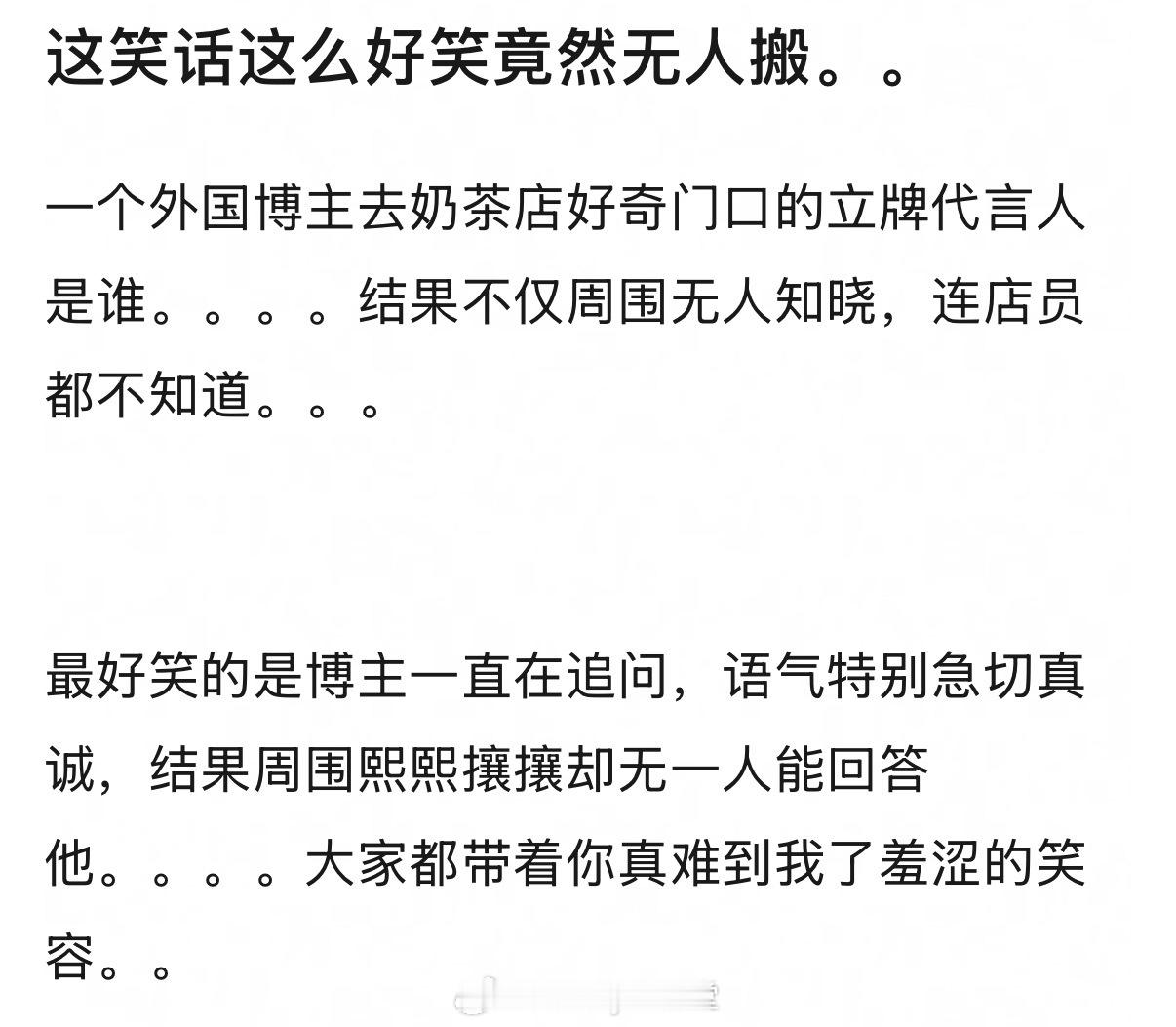一个外国博主在奶茶店问门口的立牌代言人是谁,结果无人知晓,周围熙熙攘攘没有人能给出答案……马柏全下海归来仍是素人